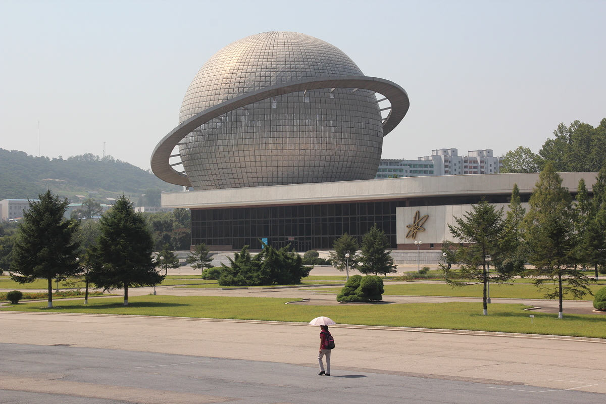 A 15 minute drive back through central Pyongyang brought us to our second stop for the day, the Three Revolutions Exhibition. In North Korea, the Three Revolutions are (1) Revolution in Ideology, (2) Revolution in Technology, and (3) Revolution in Culture. In practice, the Three Revolutions Exhibition is a large 75 hectare complex with six exhibition halls with 80,000 square metres of floor space that showcase progress and achievements in the national economy. Specifically, the six halls are devoted to heavy industry, new technological developments, electronics and space research, light industry, agriculture and literature about the Juche Idea. At the head of the complex is a huge red granite sculpture of three flags that is 27.5 metres high and 58 metres wide, with inscriptions featuring each of the three revolutions and the signature of Kim Il Sung.