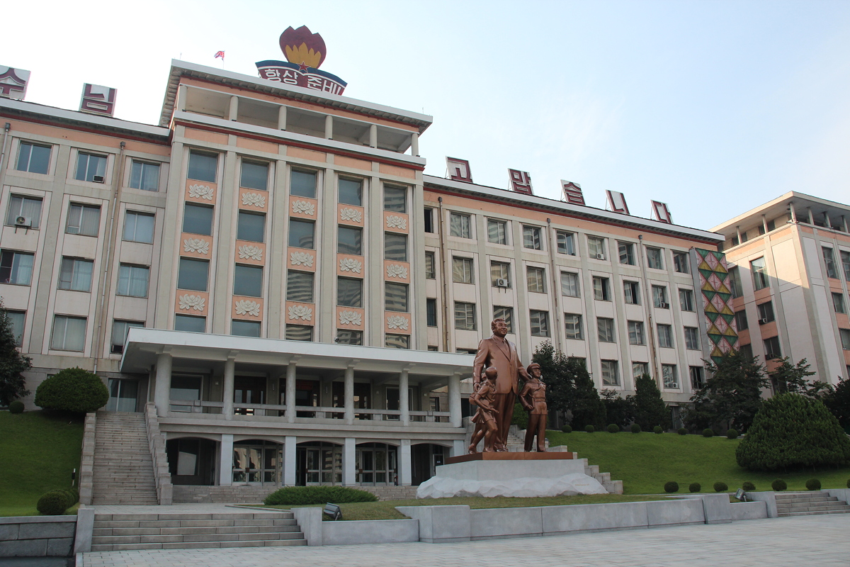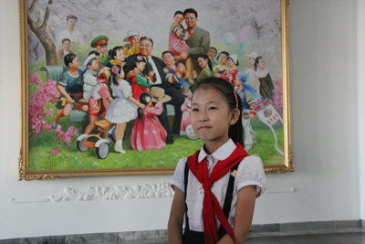 Our last stop for the day was a two hour visit to the Pyongyang Schoolchildren’s Palace. Fronted by a large bronze statue of Kim Il Sung with three children, and topped with a huge Young Pioneers Organisation badge featuring the motto “Always Ready”, this massive building in central Pyongyang provides gifted and talented after school extension programs for children in many co-curricular activities. Upon our arrival, we were greeted by an extremely confident and articulate ten year old girl who was our local guide for the visit. We were shown several of the classes, including calligraphy, embroidery, singing, traditional Korean musical instruments, piano accordion and tae kwon do before being shown to a theatre for a performance prepared by the students.