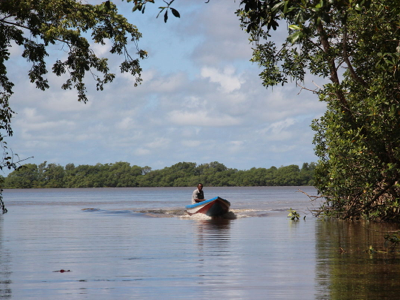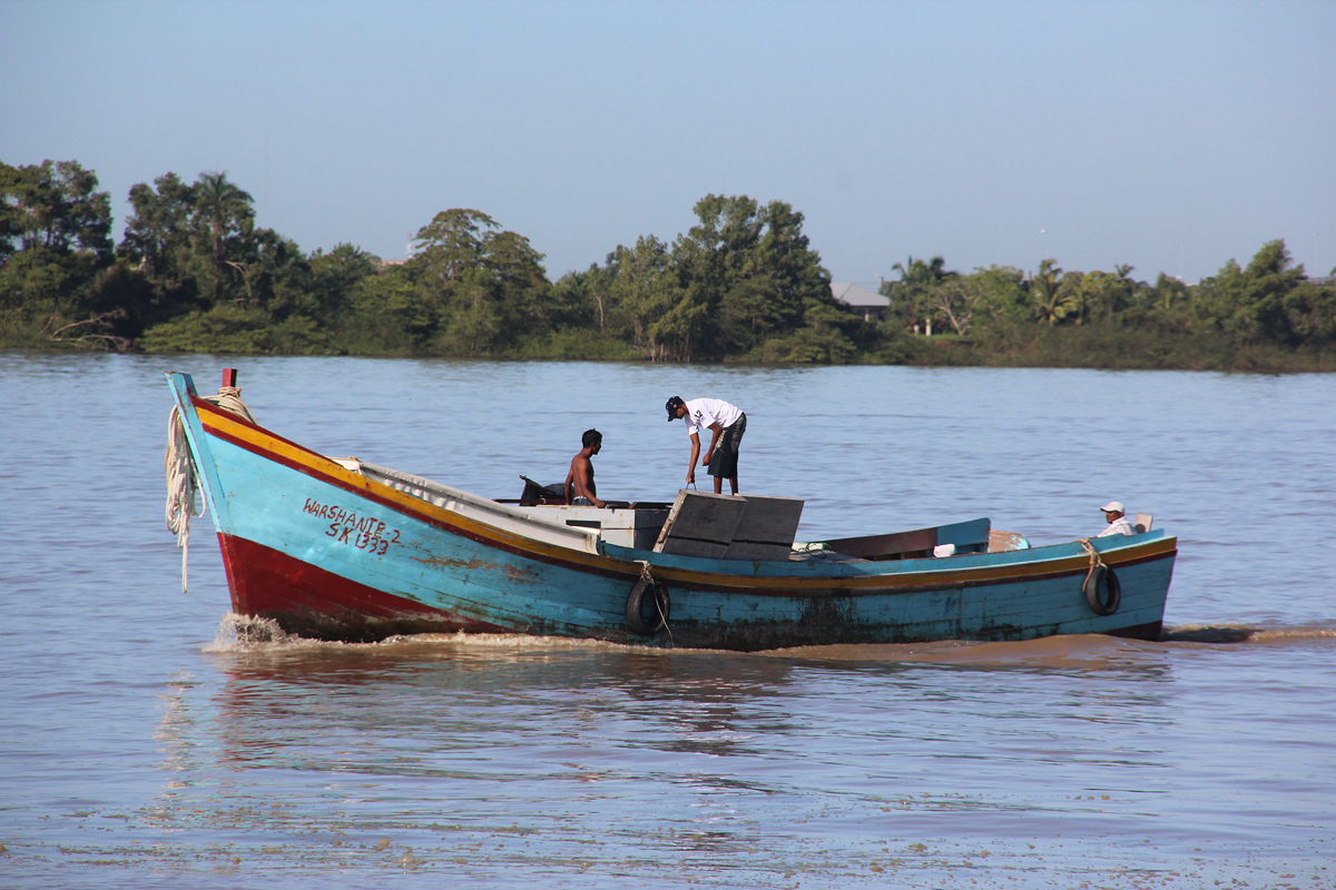 Paramaribo is situated on the northern bank of the Suriname River, which flows a few miles to the north-east where it joins the smaller Commewijne River (flowing in from the east) before both enter the Atlantic Ocean just two miles beyond the confluence. Thus, our cruise-vessel (speed-boat) travelled along the Suriname River first before turning eastwards into the Commewijne River. As soon as we left the Suriname River and entered the Commewijne, the low buildings that had lined the banks gave way to an almost unbroken line of mangroves.