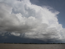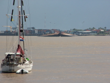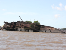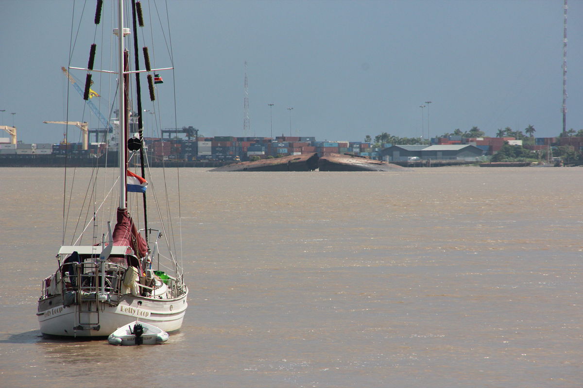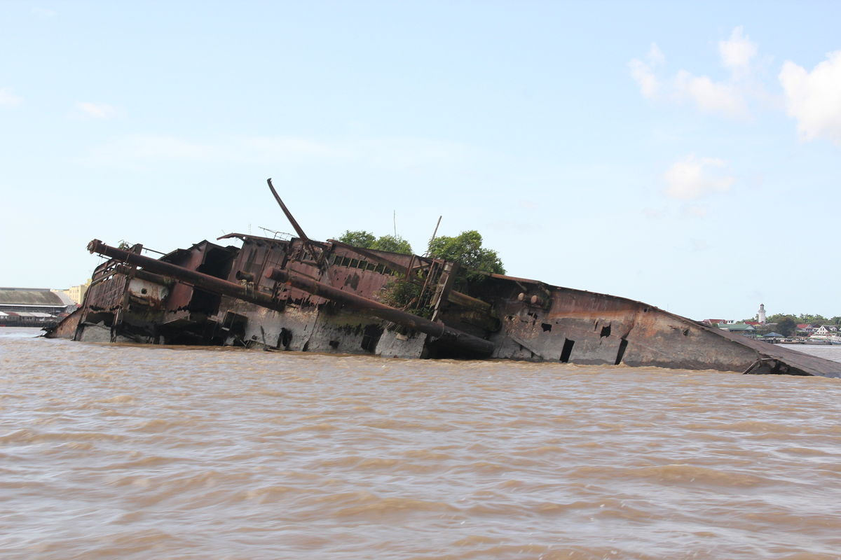 At about 2:30 pm, it was time to head back towards Paramaribo. In contrast with the clear blue skies we had enjoyed all morning, dark storm clouds were gathering by this time, accompanied by thunder and faint flashes of distant lightning. The wind had also picked up somewhat, making the return journey somewhat more bumpy and splashy. However, we were fortunate in that the storm stayed to the west of Paramaribo, so we took the opportunity to do a quick circuit of one of Paramaribo’s more bizarre sights – a shipwreck in the Suriname River – before returning to the pier.