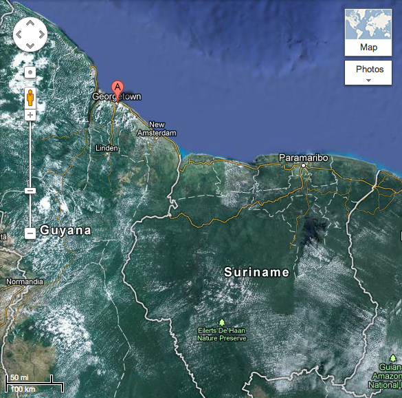 This was a very quick and pleasant flight; just one hour in the air with a landing about five minutes early at 9:40 pm. Processing immigration and customs at Georgetown Airport was far more rapid than Port of Spain, and I was outside by a little after 10:00 pm, where I met the driver (Sean) from the guesthouse where I intended to stay. The 40 kilometre drive into Georgetown was fairly quick – there is not much traffic at that time of night – and I arrived at the guesthouse just before 11:00 pm.
