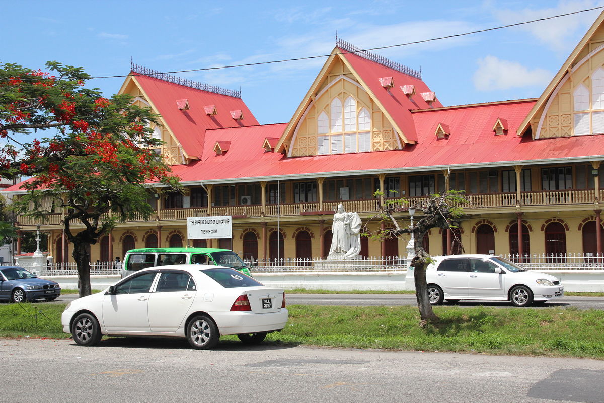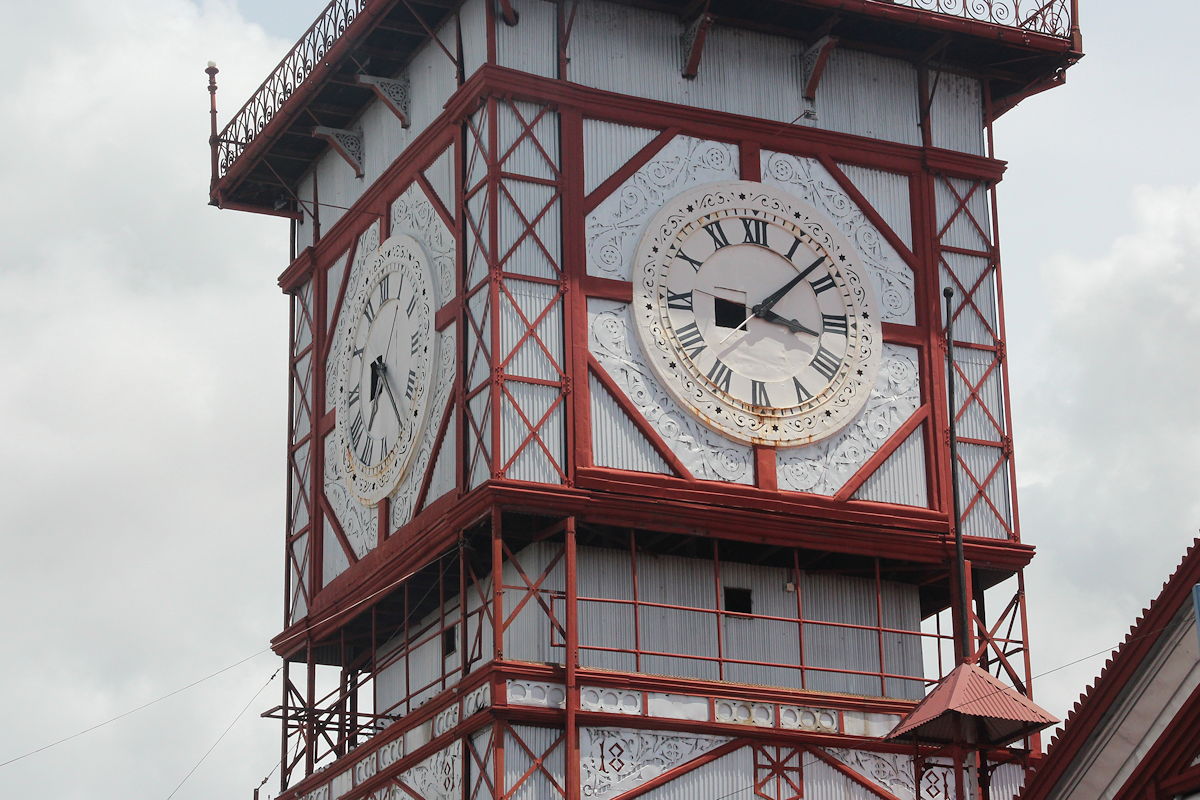 A short drive south from the Cathedral brought us to Stabroek Market. This corrugated iron building with a cast iron structure dates back to the Dutch era of the late 1700s (hence the name), although the impressive clock tower that dominates the market and the nearby minibus pickup area was built in 1880. Impressive though the clock tower was, the times displayed on each of the faces bore no relationship whatsoever either to the real time or to each other. I was interested in having a look around inside the market, but Sean insisted there was nothing of interest unless I wanted a new plastic bucket or something similar. Several other nearby buildings did catch my eye, however, especially the Victoria Law Courts just down the road from the market, where a statue of Queen Victoria (minus a hand and her nose) still dominated the front of the building.