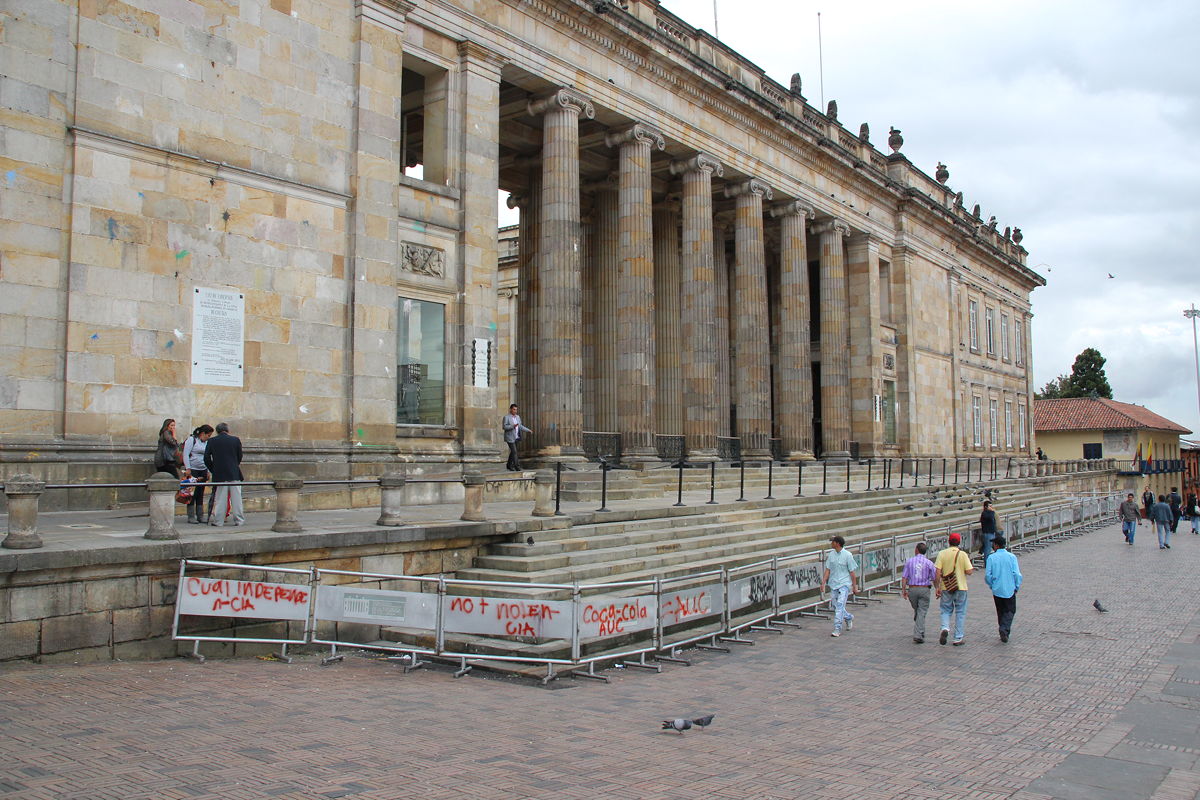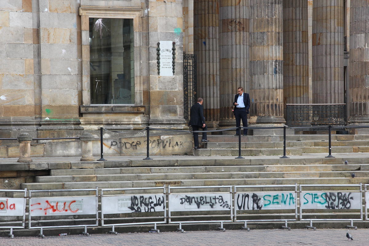 On the southern side of the Plaza, a huge building in classical Greek style was the Capitolio Nacional, which is the meeting place of Colombia’s congress, or parliament. At first I thought the building must be disused or closed for renovations because the entire front of the building was closed by low grey (of course) metal sheets covered in graffiti. However, as I looked more closely, there was a constant stream of well dressed men in well cut suits entering and leaving the building, so I can only conclude that the metal barriers were a (fairly ugly) security measure.