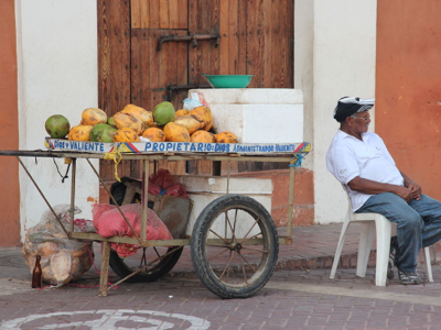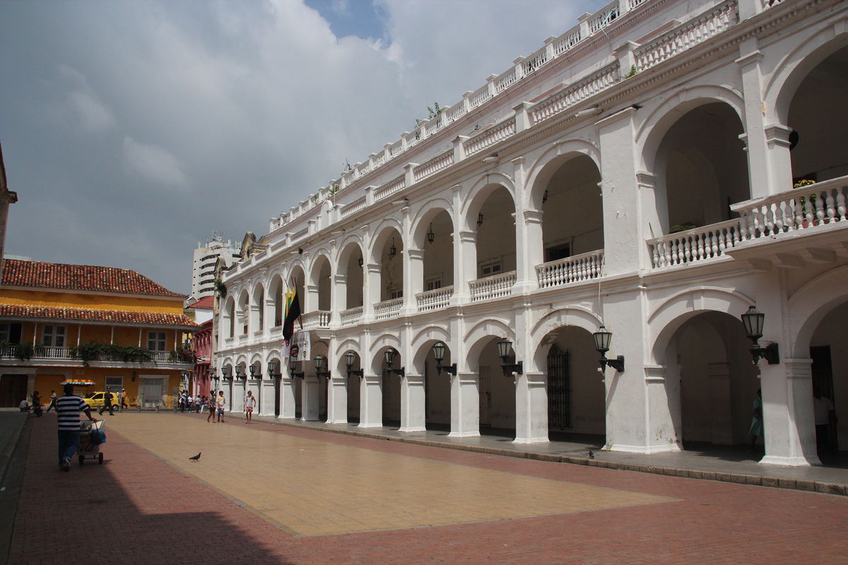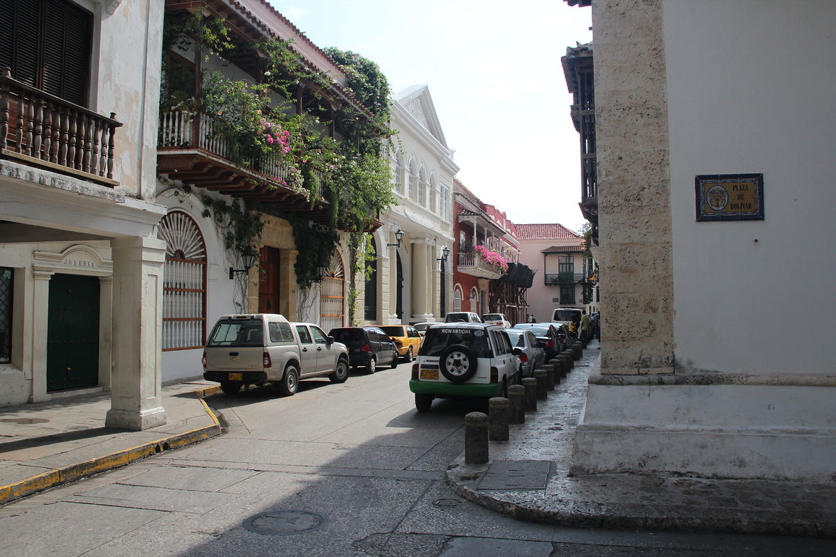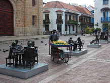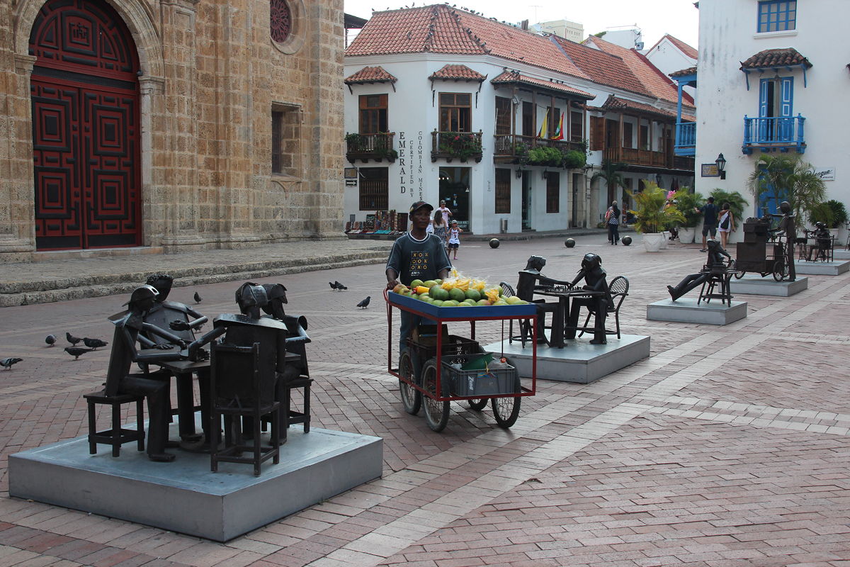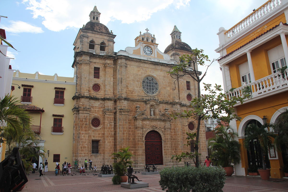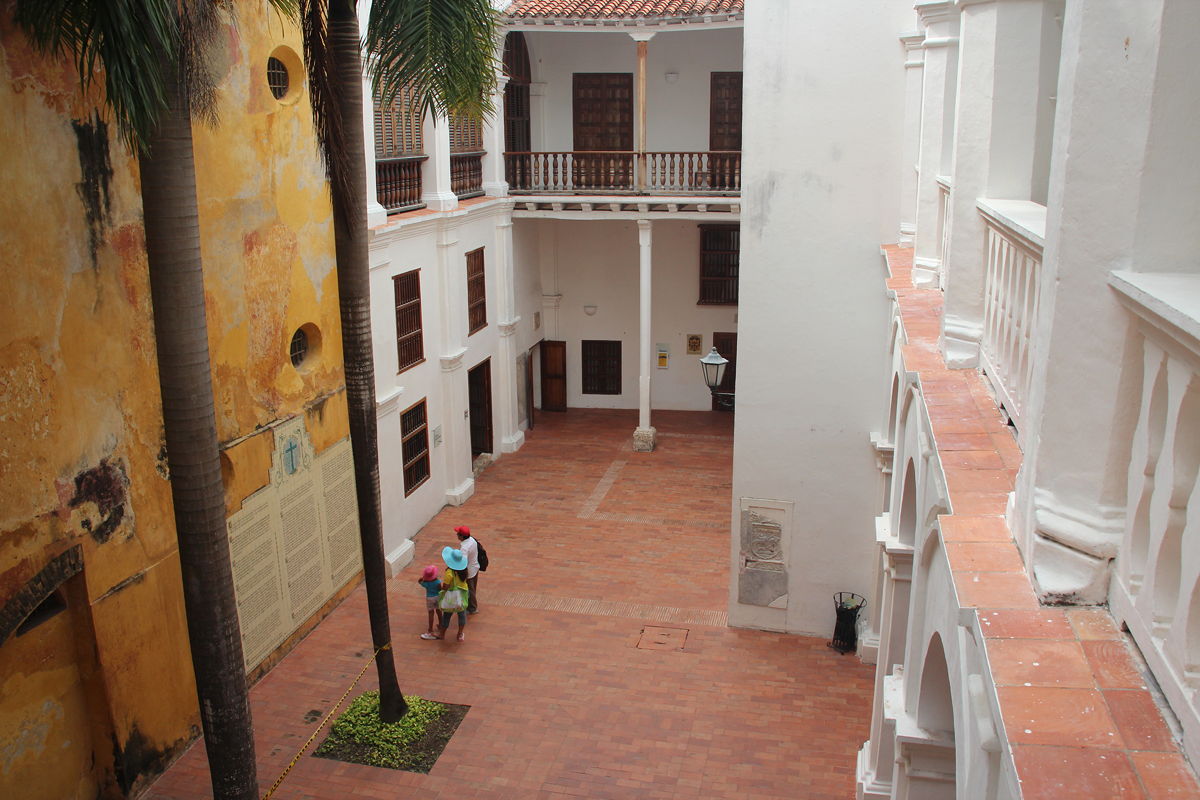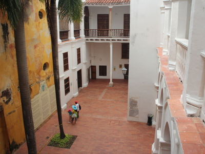 Having perhaps spent more time than I should in the Palacio de la Inquisición, I headed south to a corner of the old town that I had not seen yesterday. This area included Cartagena’s oldest and largest plaza, the Plaza de la Aduana, which used to be used during colonial times as a parade ground, surrounded by government buildings. Nearby was the huge Iglesia de San Pedro Claver, named after the Jesuit Saint Peter Claver, whose body apparently resides in a glass coffin in the high altar. Having worked in two Jesuit schools for over a decade back in the 1970s and 1980s, I was interested in having a look inside the church and its accompanying museum, but unfortunately my dwindling supply of Colombian pesos could not quite accommodate the entry fee (unless I were to have forsaken a taxi ride and walked the nine kilometres back to my hotel), so I had to satisfy myself with admiring the exterior and the surrounding courtyard.