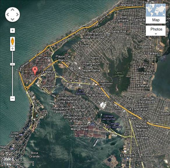 I checked the times online, and saw that the buses were not very frequent (I think they have a grand total of one in the fleet here). The first bus was due to leave the Muelle de los Pegasos (Cartagena’s old port with fishing boats and a couple of old galleons) at 9:51 am. I arrived at 9:30 am, to be told by a man who spoke no English (yes, communication still works without a common language!) that the schedule had changed and the bus was now due at 10:30 am. As things turned out, I needed all of that extra hour for the condensation inside the lens of my camera to clear. I experienced the same problem this morning that I had in Paramaribo, which was that the air was so hot and humid that condensation formed around the internal elements of my camera lens. There was no way to take apart the lens; I just had to wait, and wait, and wait.