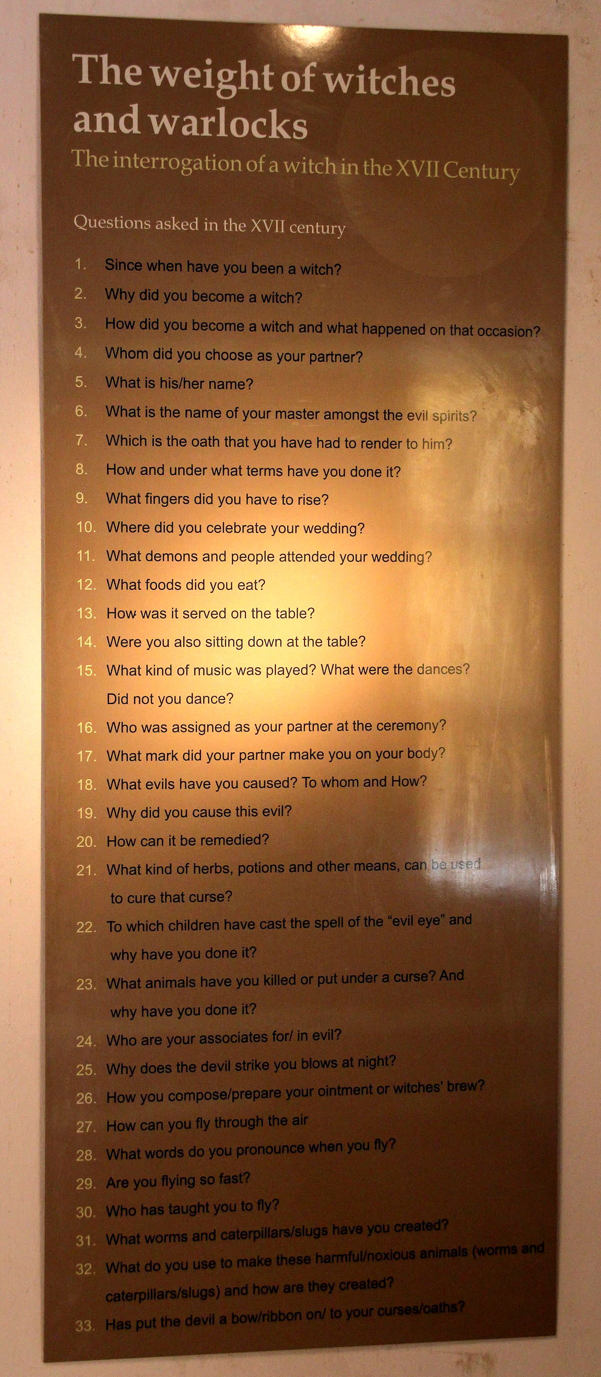 The museum had a vast array of the tools of torture that were used during the Inquisition (all originals of course, no replicas). Especially fascinating was the list of questions used to interrogate witches and warlocks in the 17th century (see image here, to the left - click to enlarge). And if the tools of torture (rack, thumbscrews, hand saw, head crusher, and many more) weren’t enough, there were the dungeons, and a skull or two to admire, not to mention the stock and hangman’s noose in the very quiet, shady, picturesque courtyard outside.