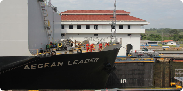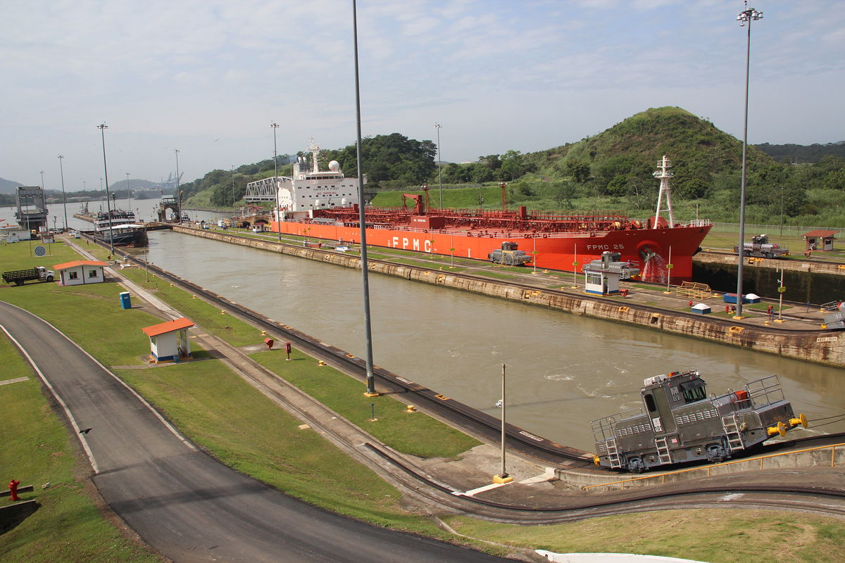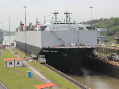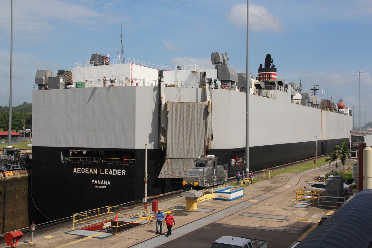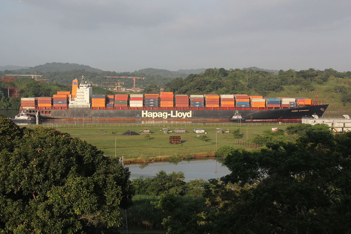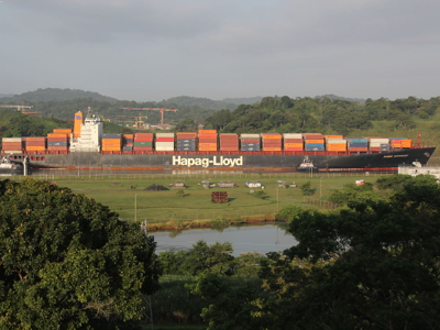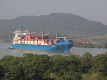 Apparently it takes a ship between 24 and 30 hours to complete the length of the Panama Canal, of which (from what I saw this morning) about an hour is needed to go through the locks at either end, waiting for the water to rise or fall to progress to the next level. The ships were pulled by locomotives on the banks of the canal as they proceed through the locks, and in some of the cases I saw this morning, it looked as though the width of the ship had been specifically designed to fit within the locks of the canal, so little was the clearance on either side.