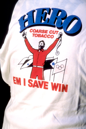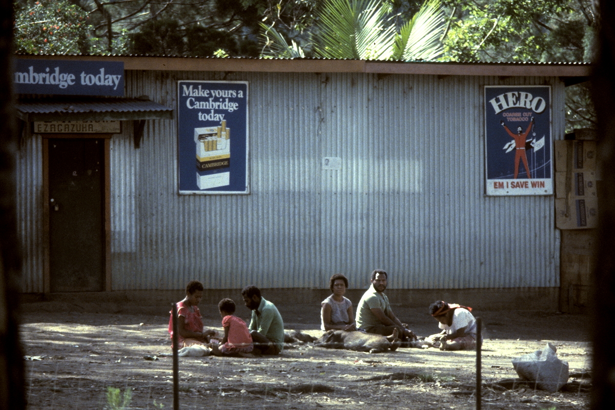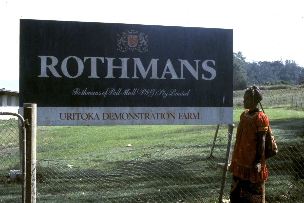 In the early 1980s, a multinational company, WD & HO Wills, had the major share of the coarse cut tobacco market with “Spear” brand tobacco. Last year (1982), another multinational, Rothmans, which cultivates tobacco on the Uritoka Plantation that we visited today, wished to break into the market, so Rothmans searched for the “right” image for their tobacco. They decided to market their tobacco as “Hero” brand, modelled after a figure something like the comic-book character, the Phantom, who is a cult figure among Highlanders in Papua New Guinea.