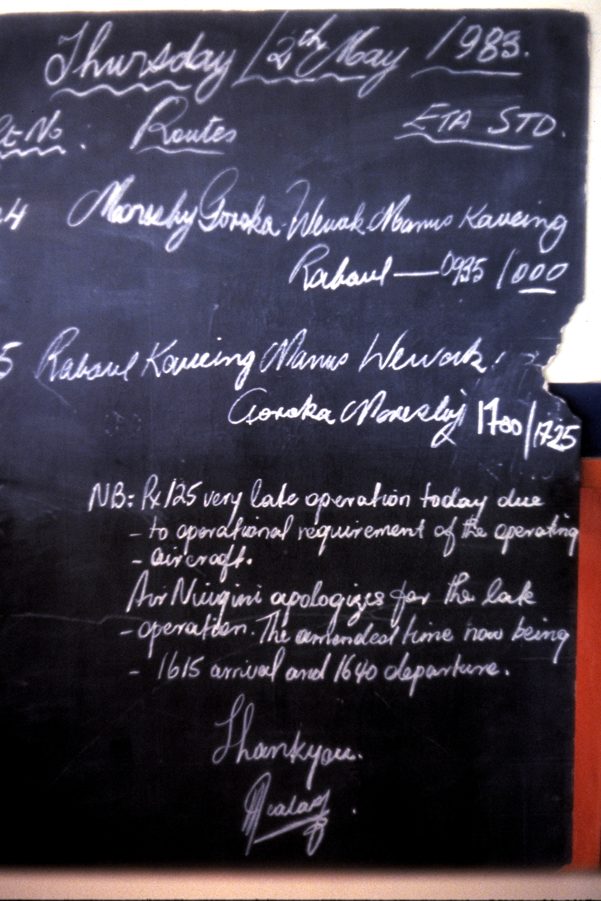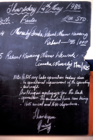 It was originally intended to catch a 2:30pm flight to Port Moresby, and inspect Port Moresby after arrival (Hanuabada village, squatter settlements, Koki markets, Paga Point lookout, House of Assembly and the University), but a 3½ hour delay meant abandoning this part of the study.