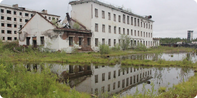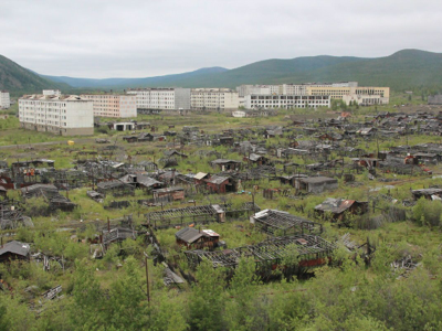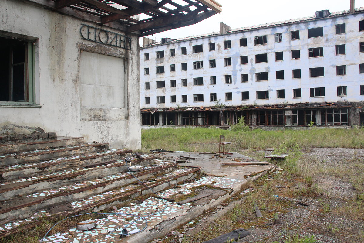 We reached Kadykchan at about 1:00pm. First impressions were, as expected, of a substantial town that had been completely abandoned and allowed to decay in a post-apocalyptic manner. Kadykchan had been established in 1936 as a coal mining town populated by prisoners, but most of the current buildings date from the 1960s onwards when the town was re-settled by idealistic and enthusiastic Pioneers. The mine closed in 1996 following a large explosion in the mine, and the town was officially shut down in 2003 when all services such as water and electricity were cut off. A few settlers continued to occupy buildings illegally until they too left, the last settlers leaving in 2007. At its height, the town had accommodated 10,000 residents.