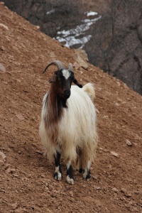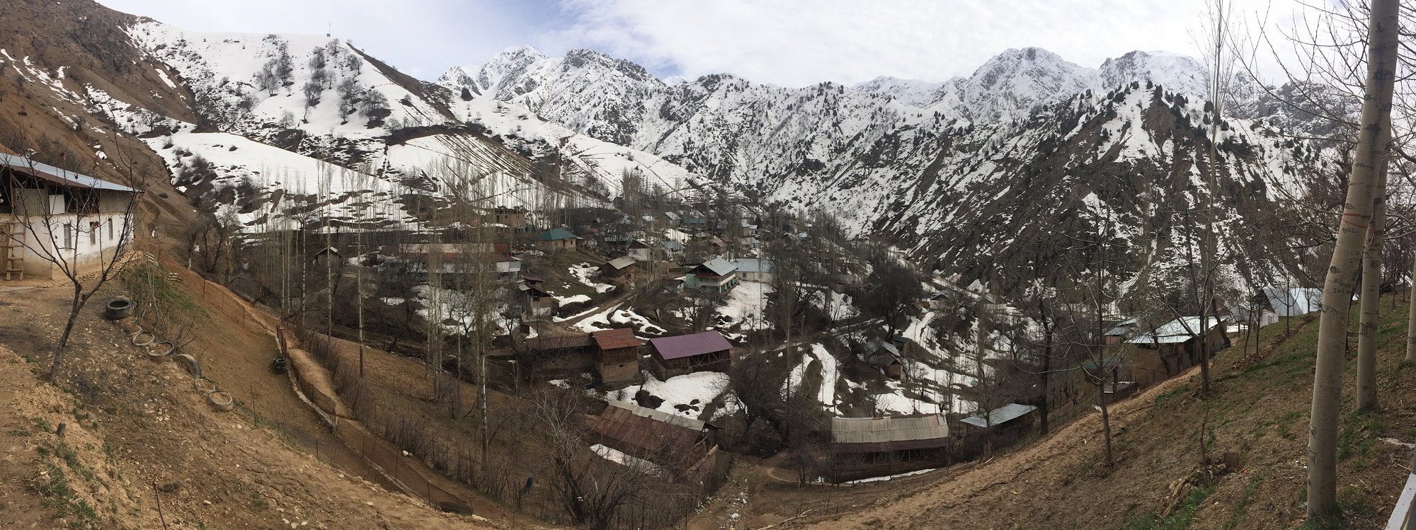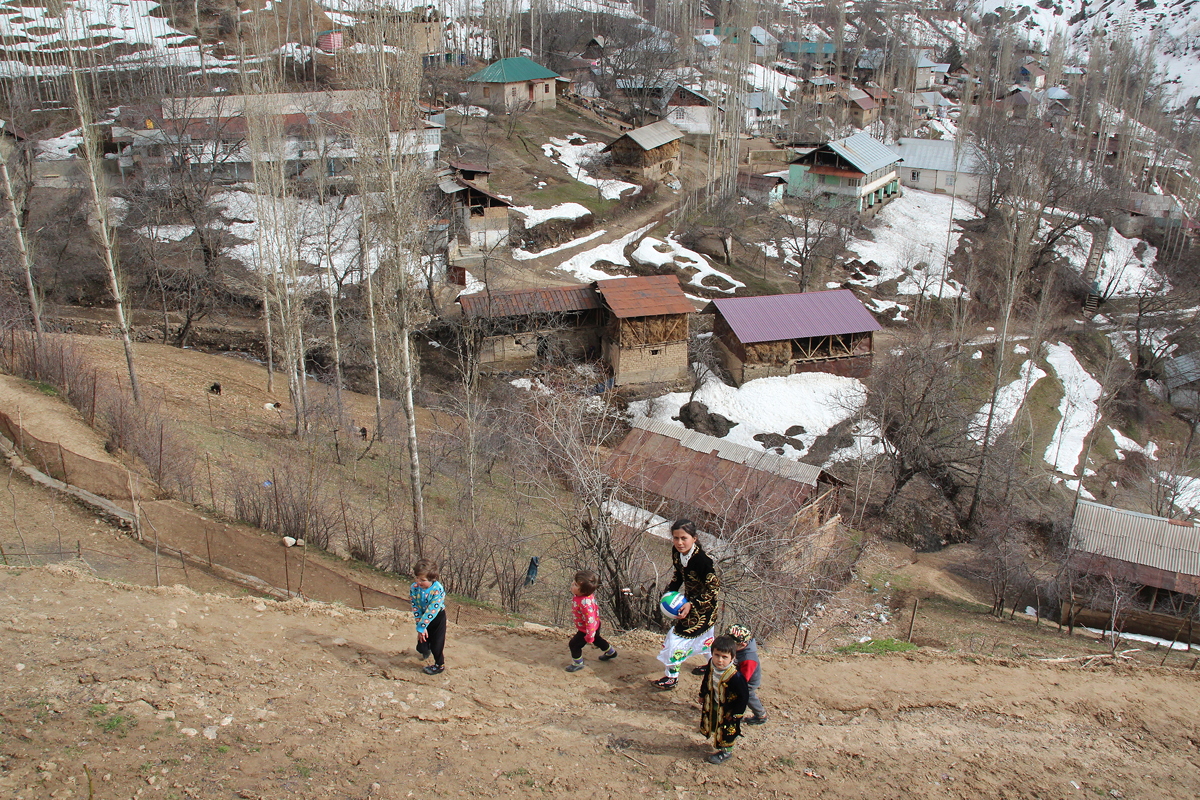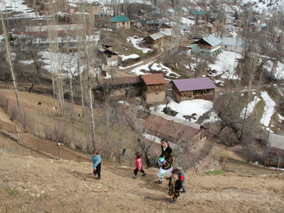 We were eventually on our way north, and after about half an hour, we turned eastwards off the main road onto an unsealed road that followed the course of a small river that was a tributary of the Varzob River. This was a rough but scenic drive, following the course of a river with huge, rounded stones and steeply eroded valley sides topped with abundant snow cover. We climbed steadily, past the uranium processing plant that was labelled as a calcium difluoride factory, until we reached the village of Takob. Our destination was a family home at the top of the village, where we were due to have lunch. Getting there involved a beautiful climb up a dirt pathway through the village, past goat sheds and houses, surrounded by snow-covered hills, up to our destination altitude of 1,800 metres.