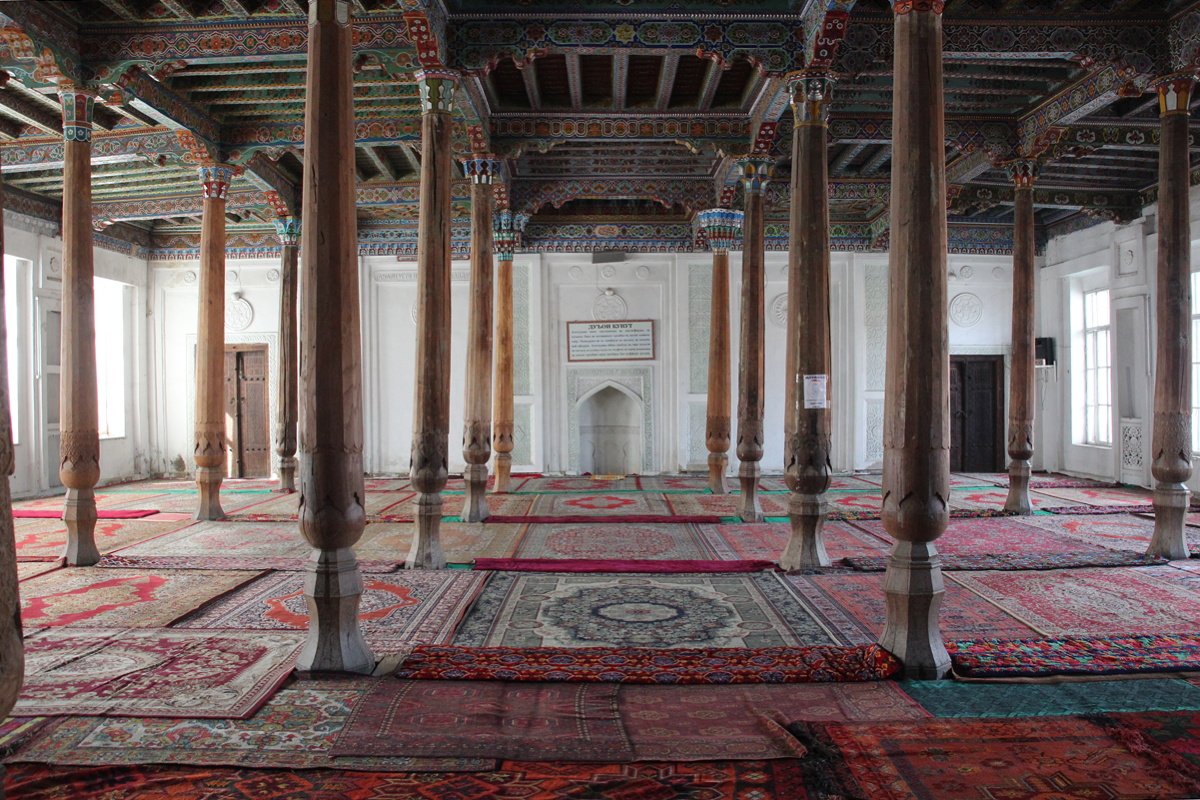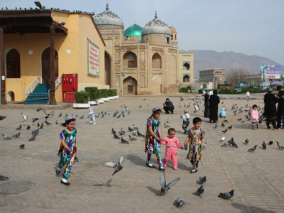 Our first ‘real’ stop was a large square that marks the traditional centre of Khujand, Registoni Panjshanbe. The square had interesting things to see on three of its four sides. We headed first to the Shaikh Maslihaddin Mosque and mausoleum on the northern side of the square, looking resplendent in the morning sunshine with its tiled minaret, turquoise dome and intricate portico. We were not the only visitors to the mosque, being joined by large numbers of local people, several of whom were children who delighted in chasing the hundreds of pigeons around in the grounds.
