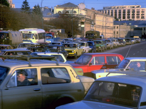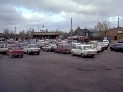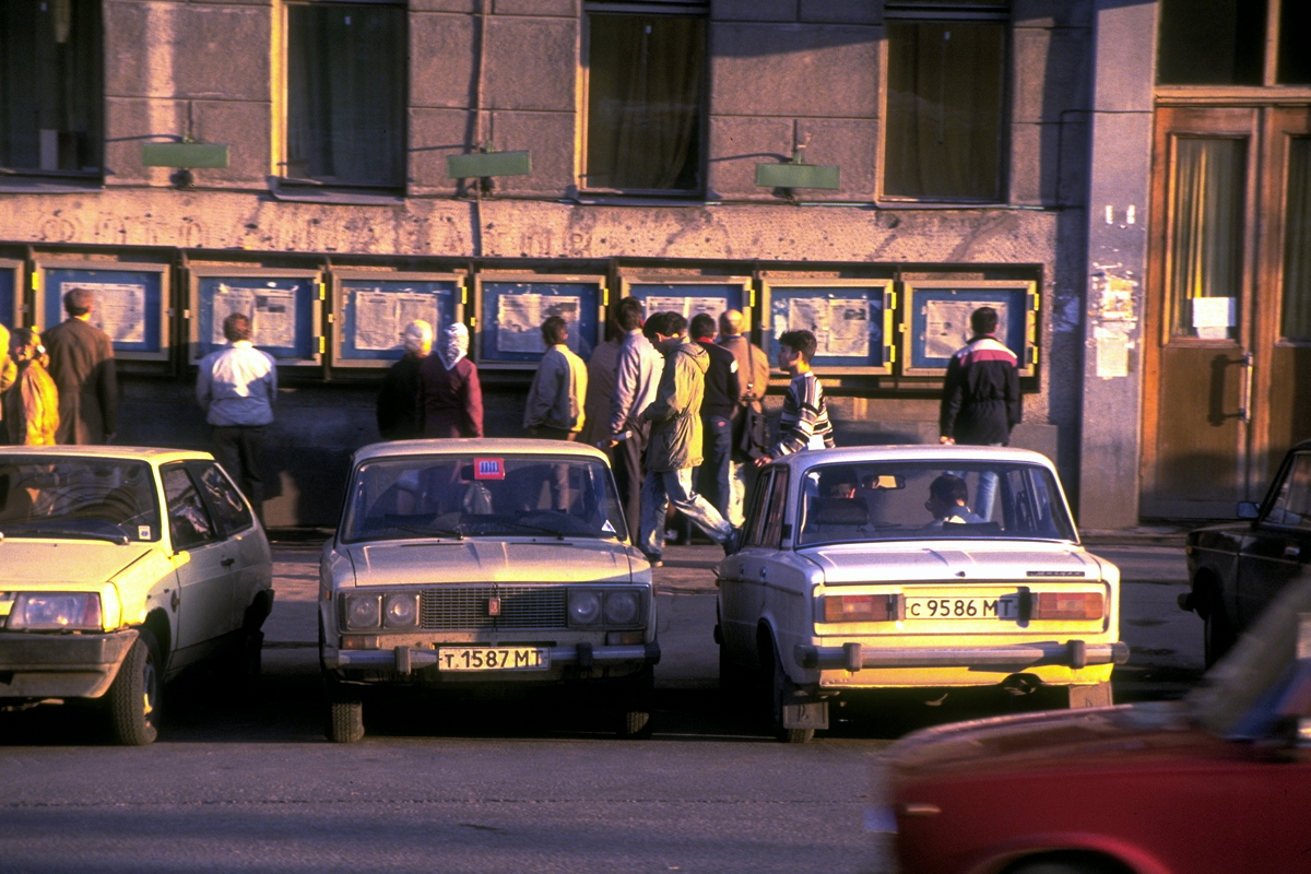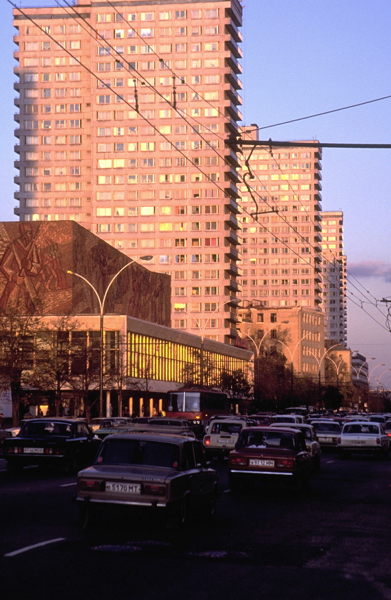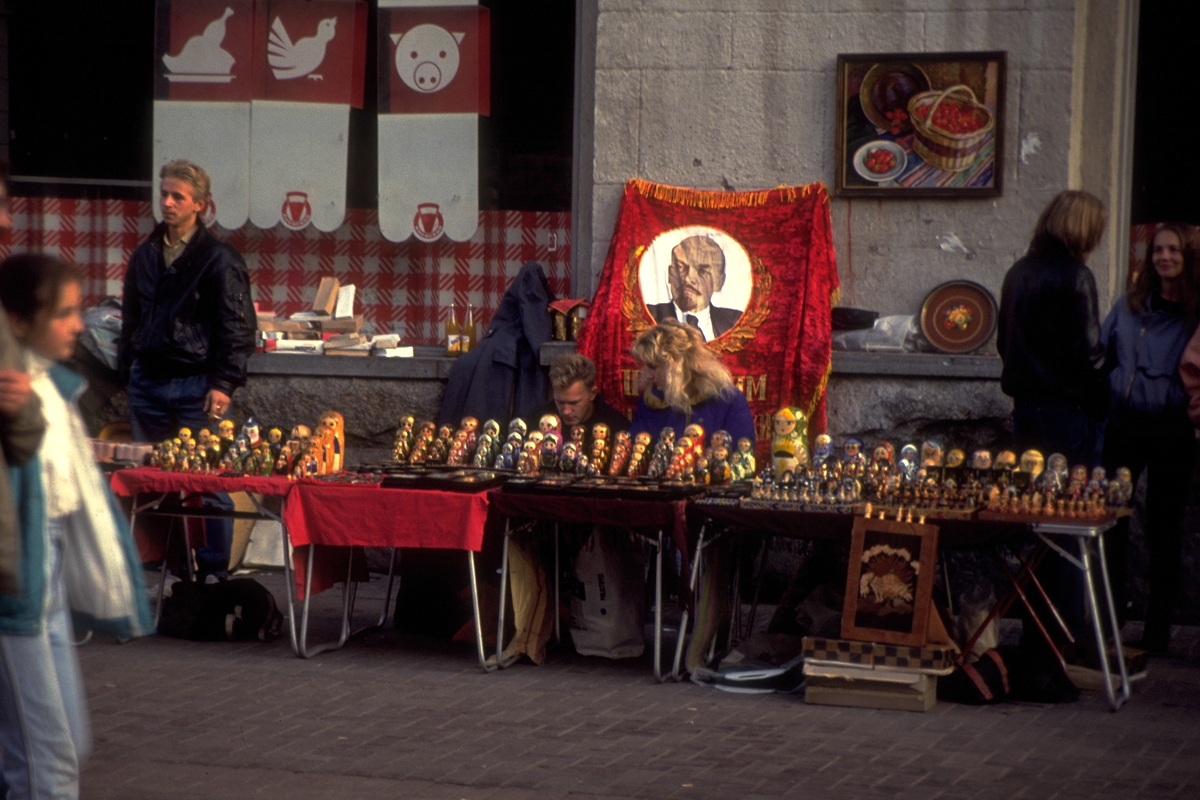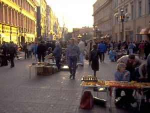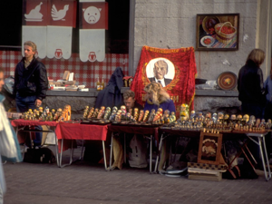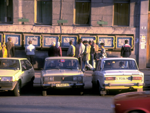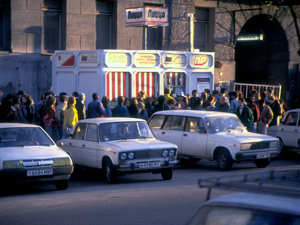Kallinin Prospekt (as everyone still refers to it) is a concrete, glass and steel environment of massive proportions. I spent quite some time in the books and posters shop, mainly because of the Soviet system of queuing three times to make any purchase. There is no self-service, so (with limited language and lots of pointing, nodding and shaking of heads) the first queue is to get to the counter and let the shop assistant know what you want to buy. The assistant gives you three identical (but differently coloured) slips of paper that you take to a second queue, which is for the cashier. The cashier stamps the three slips of paper, keeps one, accepts your payment, and then hands the other two slips of paper from the first queue back to the customer. You then join a third queue to the original counter, show the two stamped slips of paper, after which the shop assistant takes one and hands across the items that were purchased.