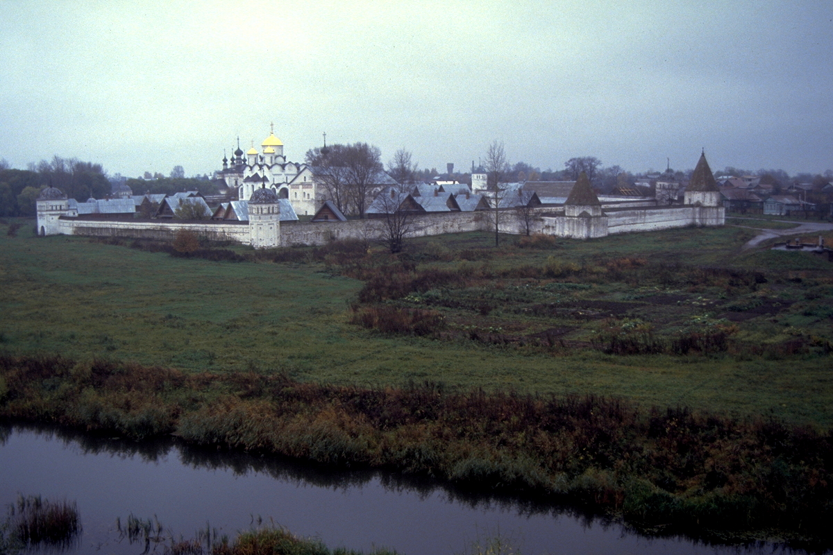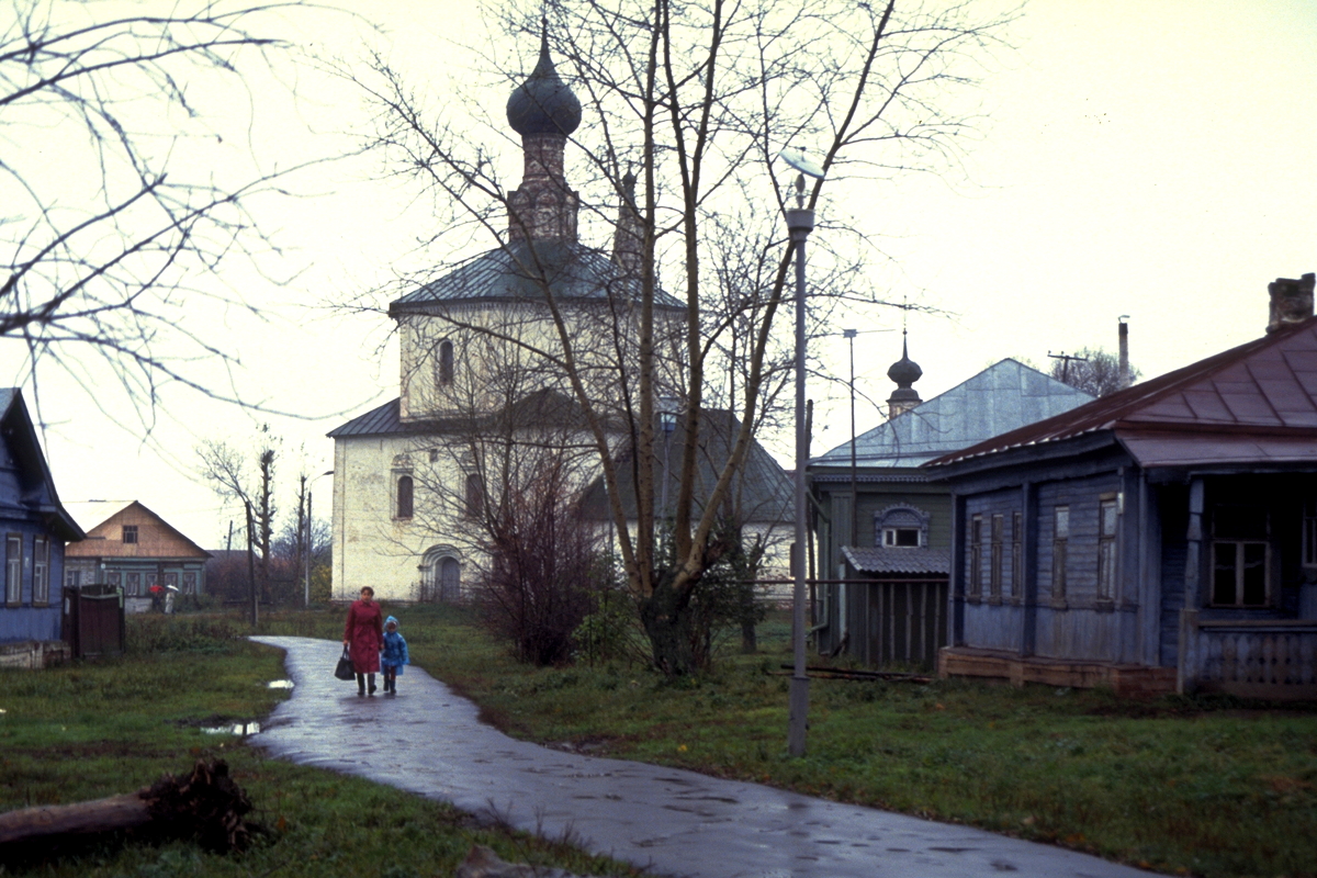 When I woke up this morning in Suzdal, it was still overcast and raining. However, the rain held off for half an hour between 7:30am and 8:00am to allow me to go for a walk before breakfast. So under very heavy, threatening skies I headed off around the top of the river embankment and around the walls of the old monastery. It was quite a walk, but almost miraculously, the heavens did not open up over me. The walk took me through more of the small streets of Suzdal with their carved wooden fronts, chooks and sheep roaming around, and well-dressed people, making their way through the mud and slush off to work.