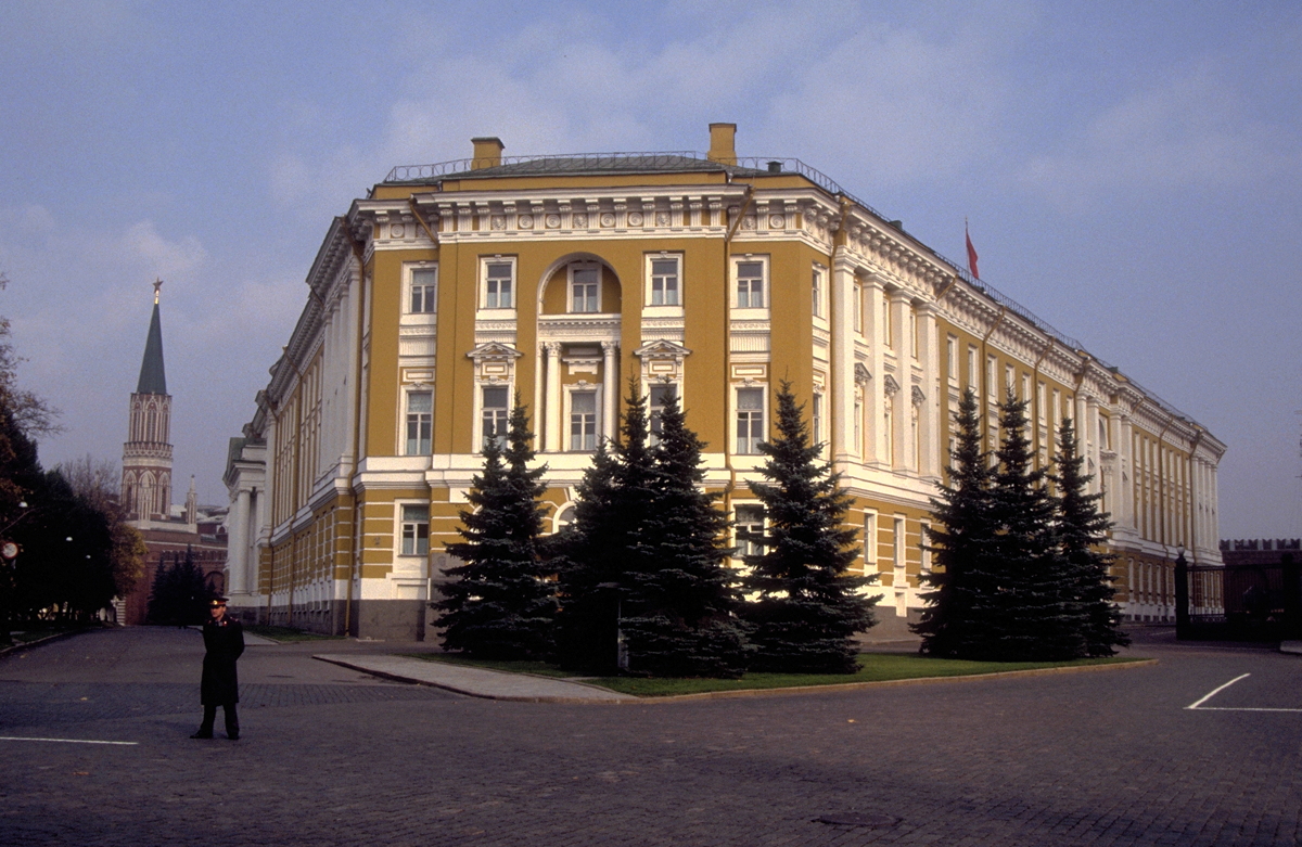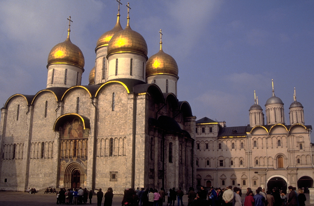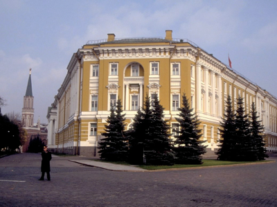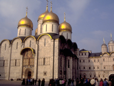 We had a day’s program organised in Moscow before our evening departure, so we set off at 9:45am for our first visit of the day, the interior of the Kremlin. This proved to be a real highlight of the trip, a trip that had more than its fair share of highlights. Tourists are not allowed into the working government buildings, of course, but we saw lots of black limousines passing through, including a high-speed convoy of six huge long-wheelbase ZiL cars, two with police at the front, one with curtained windows through which we could see a VVIP reading a newspaper in the back seat, followed by three more, the last of which contained fur-hatted central Asian looking fellows with machine guns at the ready.