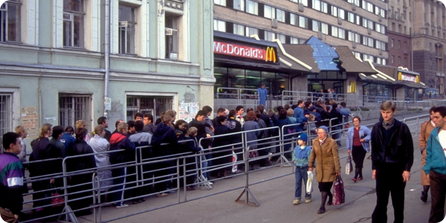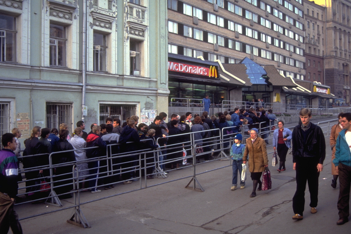 This afternoon we went on a tour of the Moscow Metro (underground railway), but before I began at 4:00pm, I wanted to go quickly and get a photo of Moscow’s latest phenomenon – the queues to get into the Soviet Union’s first McDonalds outlet which opened just last year (to the extent that anyone can get a photo of a queue that encircles an entire, large city block). I managed to achieve that, but unfortunately I became disoriented coming back on the Metro because of all the name changes of the stations. All the stations named after Communists and revolutionaries are being re-named, so the signs in the stations are a random mix of the old and new names, some of which matched my map and many of which did not. I didn’t get back until 4:30pm and so I missed the tour of the Metro. That was a pity, as the Moscow Metro is architecturally magnificent, but I had seen many of the stations when I was in Moscow in 1987, and provided they don’t dismantle the very socialist décor of the stations, it will provide me with an incentive to return to Moscow again one day (as though I would need an incentive like that!).