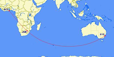 After all the pre-trip hassles, today’s long flights have been stress-free. The first leg of my flight was on an old and tired looking Qantas Boeing 747-400 from Sydney to Johannesburg. This flight of 13 hours and 6 minutes flew south-west from Sydney along the NSW coastline before crossing Bass Strait, flying over Tasmania, and then making a large great-circle loop down to a latitude of about 60 degrees South and looping up to South Africa. (The map shows the true great circle route, but our actual flight line made a wider arc and flew further to the south). I would have loved to seen some of the Antarctic sea ice that I was told was below us, but unfortunately a thick cloud cover obscured the view below.