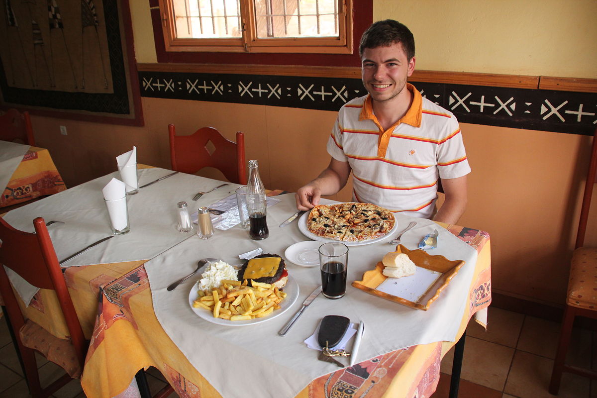 We enjoyed quite generous meals in the hotel’s dining room – a hamburger with potato fries for me (with a huge meat patty made from extremely finely minced local longhorn cattle that I am sure was fat-free, grass-fed and hormone-free), and an African-style chicken pizza for Andrew (African style chicken means there is not much meat, lots of gristle and a more than adequate number of small bones).