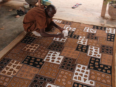 After lunch, we had time for a short rest before meeting Mama to go for a guided walk through the suburb of Segou where our hotel is situated.  Our walk began south-east along the main road (Route Nationale 6) where our hotel is located until we came to a large former quarry from which the French had mined clay for use in road construction during the colonial era.  On one side of the quarry was a collective workshop where textiles (or more specifically, mud-cloth) were being made using traditional techniques.  The designs were very artistic and delightful to look at; I wish I had the wall space at home to display some of these wonderful creations.