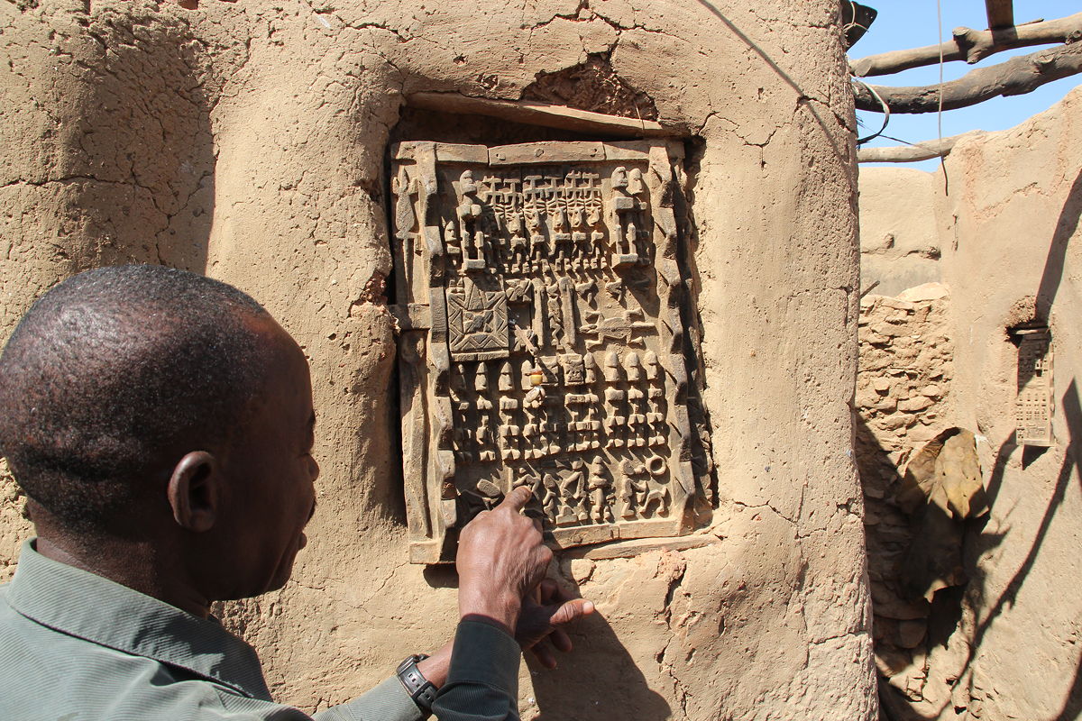 Emerging into the light at the other end of the cave, we saw a small mosque that marked the beginning of Gogoli village, another Dogon settlement.  The layout of Gogoli was linear, lining the edge of the top of the escarpment.  As we passed through, a resident with excellent English (apparently a former guide) invited us into the courtyard of his home to show us his carved door and window, both of which made him justly proud.  Carved doors and windows, with their wooden locks, are a feature of traditional mud brick Dogon homes, and he was keen to help us understand the significance of the fairly standard arrangement of figures carved into them.
