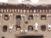 As we were walking over to the lower side of Sanga, we were welcomed into the home of a hunter.  The exterior of his home was decorated by the skulls and other bones of various types of animals he had killed, and an interior room off his inner courtyard was even more lavishly decorated with bones (and I think quite a few pieces of cartilage too; they were a little difficult to identify).  His interior room was filled with wooden Dogon masks and other wooden carvings that he had collected; dusty as they were, I think he was hoping I might offer to buy a piece or two.  Clearly he doesn’t know about Australia’s quarantine regulations.