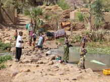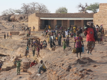 More walking brought us to the onion gardens, verdant green and being tended laboriously by a large team of women carrying buckets of water on their heads from a well and pouring them loving over their onions.  I could only think what a saving of labour could be made by installing some irrigation pipes, but of course, the balance of Mali’s resource endowment is people-rich and capital-poor.  Pipes are expensive and wages are almost zero (especially for children), hence the intensity of the work we saw in the onion fields.
