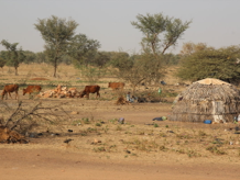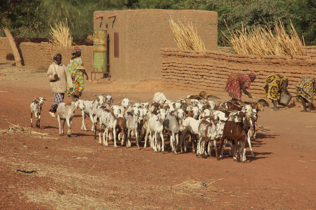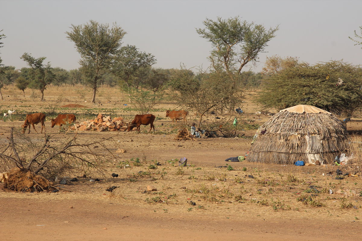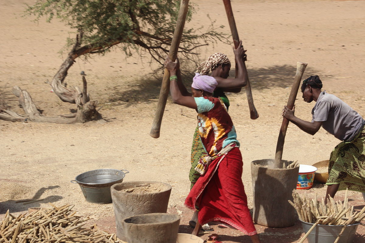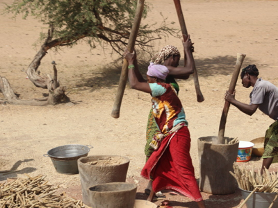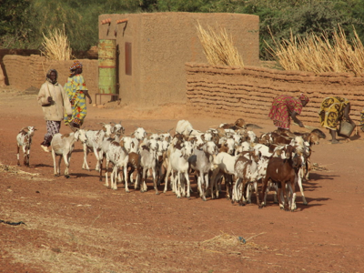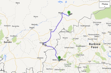 Our route took us from Bandiagara (marked “A” on the map above) west to Sévaré, which is just to the east of Mopti, and then south along the Route National almost to San, where we headed for Koutiala, the town where we stopped for lunch. The roads were generally good, being sealed and in reasonable condition, and the countryside comprised scrub and semi-desert landscapes. There was a surprising amount of interesting activity taking place along the roadsides – women pounding millet, children drawing water from wells, men driving herds of goats and cattle, women carrying cargo long distances on their heads (including one interesting group carrying milk in bowls on their heads to market), and so on. None of these was a “sight” in itself, but together they gave us a lovely cross-section of everyday rural life in Mali.