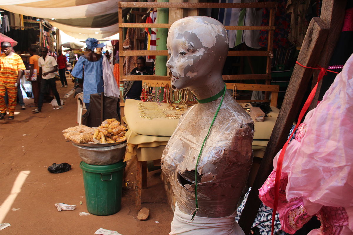 The walk around the old town was wonderful, but after that it was time to explore the newer part of Bobo-Dioulasso, and especially the Big Market (Grand Marché).  Covering the area of several city blocks and housed under several substantial large covered shelters, the market was a remarkably hassle-free place to explore a typical West African market on a grand scale.  It was all here – clothes, fruit, vegetables, meat, tailors, and much more, all arranged in neat surprisingly rows and separated by narrow, crowded laneways.  It was friendly, colourful, and in the case of the meat and fish sections, quite aromatic.