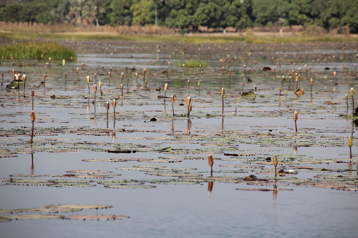 The reason we had come to Banfora was to go to Lake Tengréla, about 7 kilometres to the west of the town.  The lake is famous for its hippos, and the dry season (i.e. now) is supposed to be the best time of year to see them.  Getting to the area where the hippos are found involves a ride in a small wooden pirogue, in this case one that is rowed.  It was a lovely experience being out on the lake, enjoying the gentle breeze across the smooth waters on this hot day, with the only sounds being the soft brushing of the water lilies against the side of the boat and the scraping and splashing sound of a large tin can on the bottom of the boat as Mama frantically scooped out the water that was leaking into the boat through the hull.