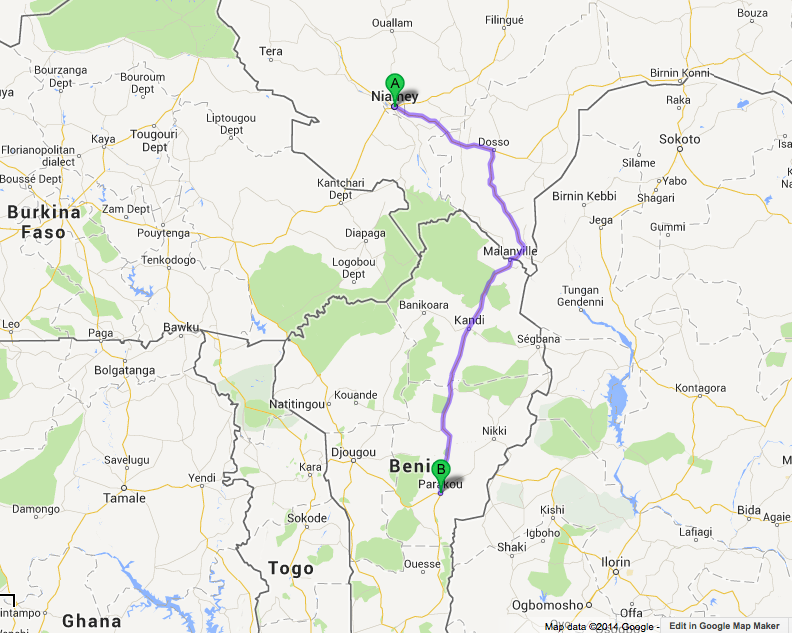 The drive that lay ahead of us was indeed a long one.  Our destination was Parakou in Benin, a distance of 615 kilometres that Google Maps suggested should take 8 hours and 18 minutes driving time.