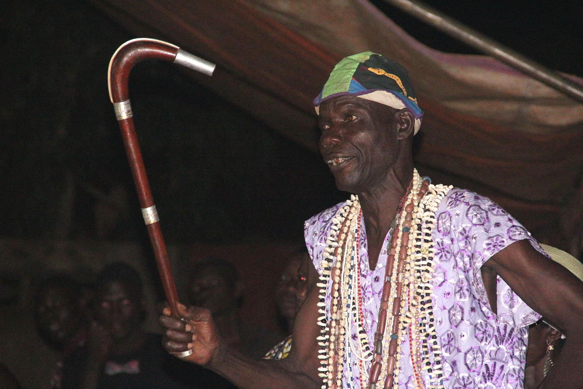 Unfortunately, everything was very difficult to photograph because it was so dark; there was just a single low energy bulb illuminating the “circle” as the dusty rectangular ceremonial area was known.  As the dancers arrived (mostly men dressed as women), the door to the fetish house (where the idols are stored) was solemnly opened, some fetishes were brought out, and the dancers began.