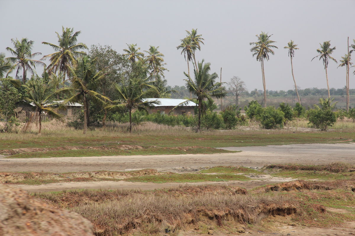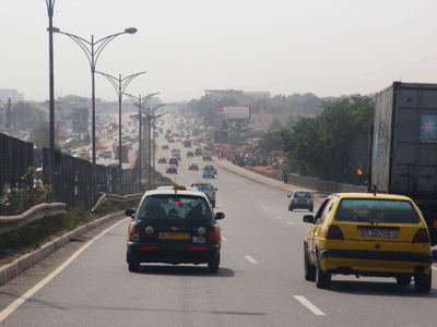 Eventually we were on our way.  After an initial short rough dirt road, the highway became an excellent sealed road, easily the best we have seen so far in West Africa with wide lanes, smooth edges and no potholes.  Unfortunately, the air conditioning that had worked so well for the three minute drive to the border refused to work for the rest of the day, so we had to drive at speeds of 100 to 120 kilometres per hour with the windows down.  The wind was hot and the car was so noisy that we had to shout to communicate with each other.  Worse, the car was periodically filled with black, greasy exhaust fumes from badly tuned diesel trucks and buses which, when mixed with the dust and smoke in the air from the many grass and cooking fires, created an acrid mix that made the eyes sting and provoked more than a few coughing fits.  It was not the most pleasant drive of the trip.