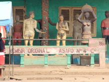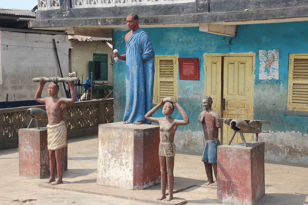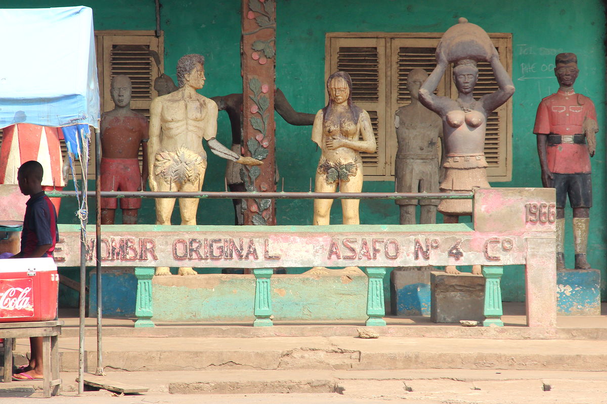 Before returning to our car, we walked along some of the streets beside the fishing port to see some of the posuban shrines. Unique to central Ghana, posubans are elaborate concrete shrines erected in urban areas by the local Fante people. The shrines are built by Asafo companies, which are traditional patrilineal military units. Although they were once responsible for the defence of the towns, these days they simply perform a ceremonial role.