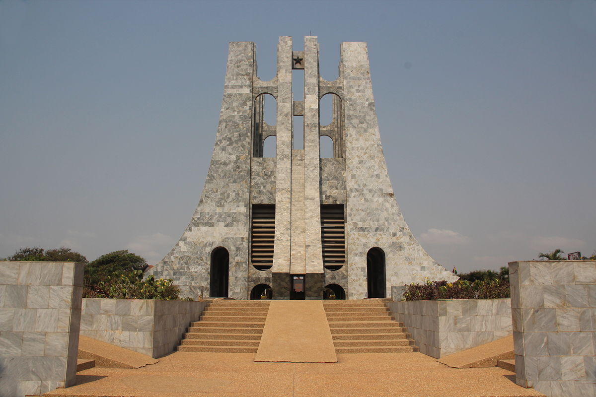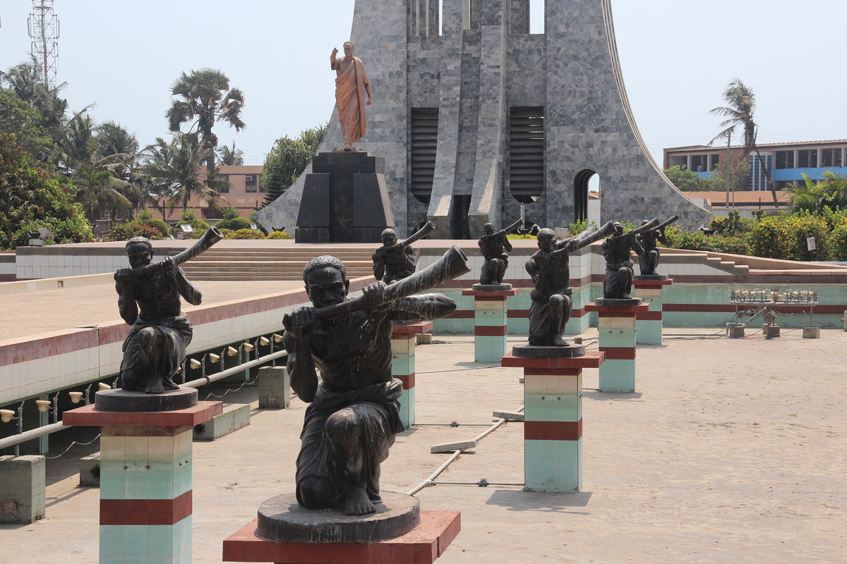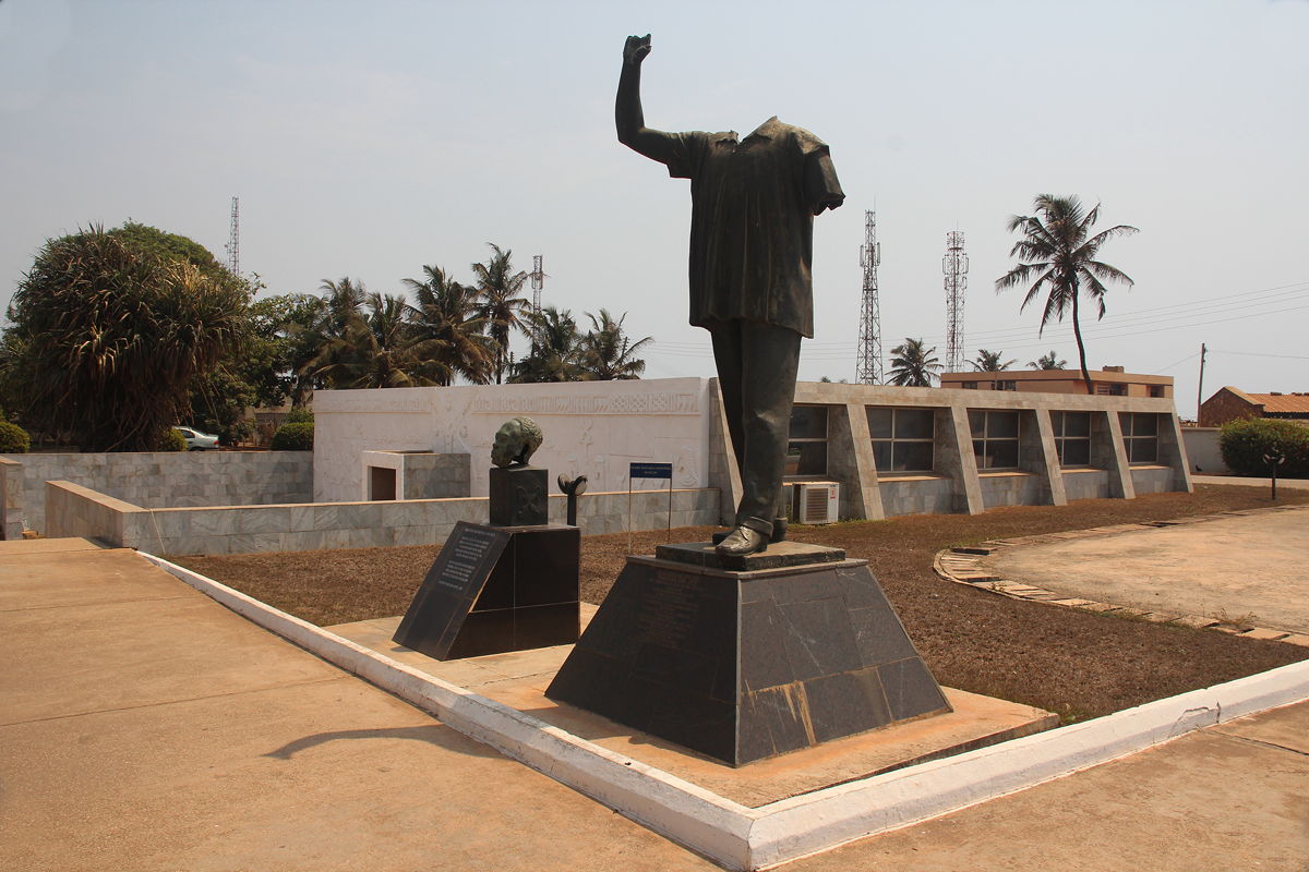 Having explored the fishing village, we returned to the car and drove a short distance eastwards to the Kwame Nkrumah Memorial Park and Mausoleum.  Kwame Nkrumah was Ghana’s first president following independence from Britain in 1957, and his body is buried at the base of a large, abstract, grey monumental structure.  There was also a small museum to honour Nkrumah, featuring an esoteric collection of objects such as his work desk and telephone, his bookcase, his sofa, his coffin, the covers of some of his books and some of the jackets he wore of special occasions.  There was also a collection of photos (mostly with very poor compositions and picture quality) of his meetings with various world leaders such as Mao, Kennedy, Khrushchev, Castro, Nehru and others.  In a separate glass-sided shed, Nkrumah’s Cadillac limousine was exhibited, although the flat rear left tyre was almost as depressing to see as the thick layer of dust covering the car.