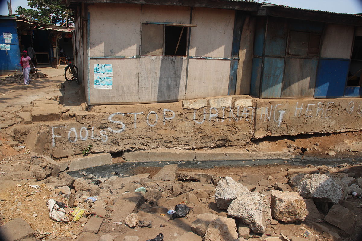Having brushed up on Ghanaian history and culture, our next visit was to Jamestown.  Jamestown is the historical part of Accra, containing many old British colonial buildings.  However, it is not a privileged area; much of Jamestown comprises shanties and slums.  The low land value seems to reflect the sad reality that the area is being heavily eroded by the ocean; we saw ample evidence of collapsed buildings and fences that have fallen away from the tops of undercut cliffs into the crashing waves below.