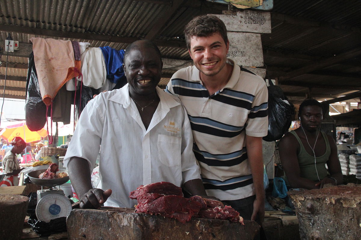 In contrast to that description, Andrew and I actually found it a little tame, certainly after our experience at the huge market in Kumasi.  We began by getting an elevated view of the market from a building within the market that had several stories.  We found that this was an excellent way to get an overview before diving into the bowels of the alleys and stalls.  Once down at ground level in the alleys, the crowds were not especially dense (maybe because it was mid-to-late afternoon), and we found the stall holders to be among the friendliest we have yet encountered in West Africa.  The butchers were especially friendly, competing with each other to get us to take their photos, and I had a few light hearted banters with other men with beards as we compared our chin growth.  I suspect that “Hey, I like your beard” must be one of the standard sentences that every Ghanaian child learns in school, as it has been the greeting used by many local people throughout this country on hundreds of occasions to start conversations.