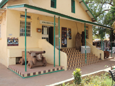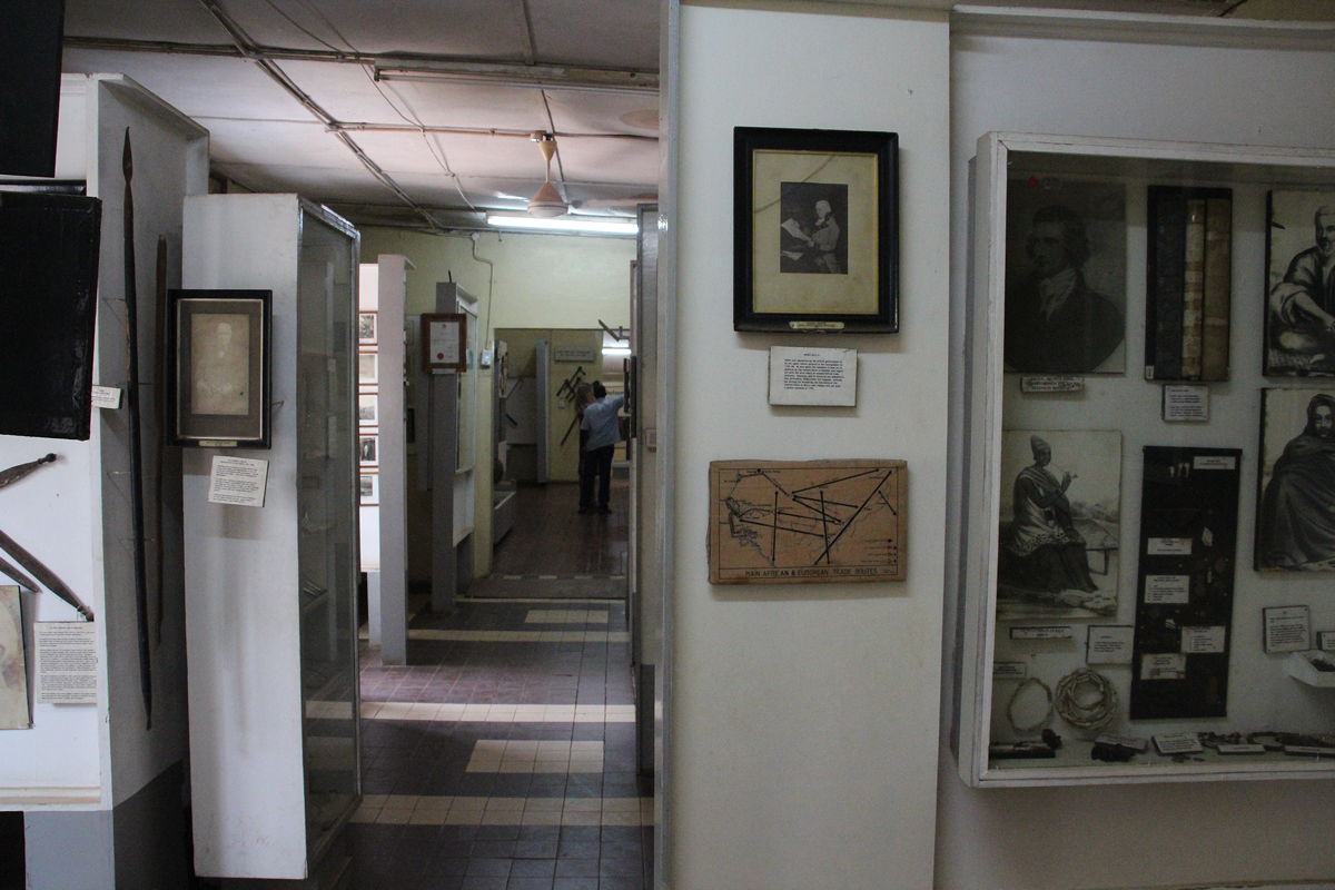 Our second stop was the National Museum.  Housed in a tiny colonial building with creaky wooden floor boards and authentic, un-retouched British-era paint on the ceilings and walls, the museum is small and badly lit, with a decaying collection of dusty exhibits and yellowing photographs that seem completely appropriate in the context.  Anyone used to a touch-and-feel interactive display would be disappointed within about 10 seconds, but this is a genuine colonial-era museum set out in the traditional colonial manner – dark, narrow corridors with fading photos, many photographs of apparently once-important people, many examples of significant documents in old glass-fronted picture frames, mould on the walls, but amongst everything, some unexpected gems (such as historical maps and some tribal crafts) that are genuinely enlightening.  I especially liked the display of the current President’s school uniforms and the set of Encyclopedia Britannica volumes that he used as a boy.  Unlike several of the museums visited on this trip, photography is allowed within the museum (which, as you probably know, I see as a very positive feature).