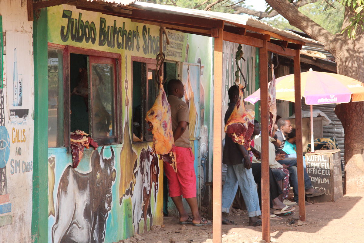The second stop was the cattle market at Abuko, a settlement to the south of Serrekunda.  There were two parts to the market, cattle on one side of the yards, and goats and sheep on the other.  Both cattle and sheep seemed in excellent condition, and were eating grass and other feed from old car tyres – single tyres in the case of the cattle and stacked piles of tyres for the goats.  The market was picturesque, and considerably calmer than I had been expecting.