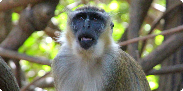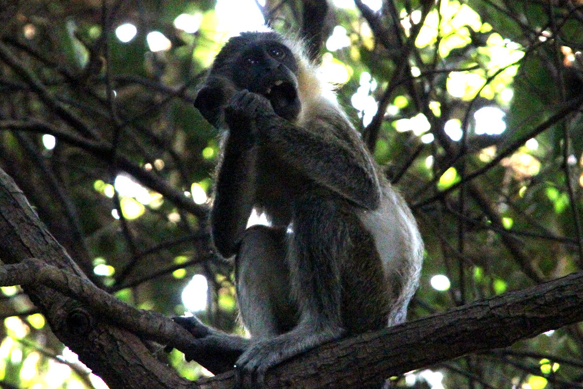 It was a very special experience to see about 15 green vervet moneys in the wild at various stages during my walk, eating fruit and swinging from branch to branch (the monkeys that is, not me).  There were also about half a dozen of the much shyer red and black monkeys, who spent much of their time today peering around large leaves to look at me before ducking behind the leaf if they thought I might be looking back at them.  Even shyer than the red and black monkeys are the antelopes; I managed to spot just one of them as it ran off into the bushes.