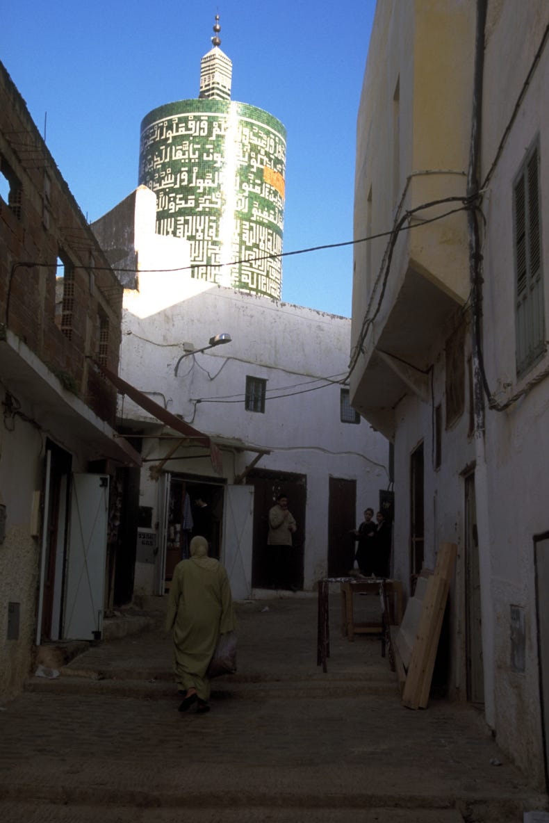 We parked the car on the edge of Moulay Idriss, because the town itself is impossible for cars, as the ‘streets’ comprise narrow winding laneways that turn into flights of steps. There is a bit of a sense that visitors are intruding into the locals’ personal space in Moulay Idriss, even though people are friendly enough. It is impossible to find one’s way through the town without a guide – it is also impossible to make any progress without being hounded by a local person who wants to be your guide, so despite misgivings from Di (she wanted to walk alone, and certainly have to pay some local person) we followed the lead of a local man who spoke some English. He was excellent, and took up through a winding labyrinth of streets and laneways up the hill to a vantage point from where the mosque and the town could be seen. The town is divided into two parts, Berber and Arab, and most of our time was spent in the poorer but prettier Berber section, even though our ‘guide’ was Arab. Another great benefit of having a guide is that the locals stop hassling you to take them as a guide, and I think Di accepted in the end that having him was a good thing, even though she thought I paid him too much for his services.