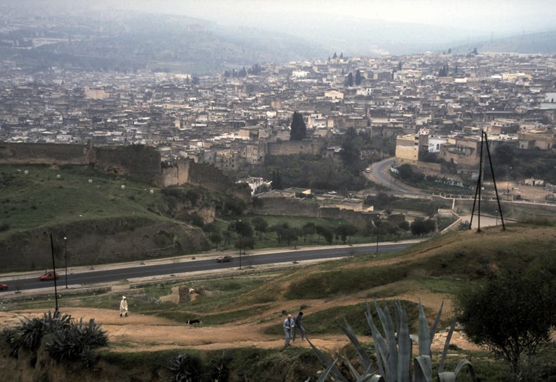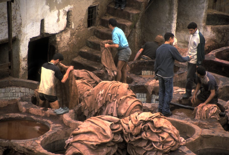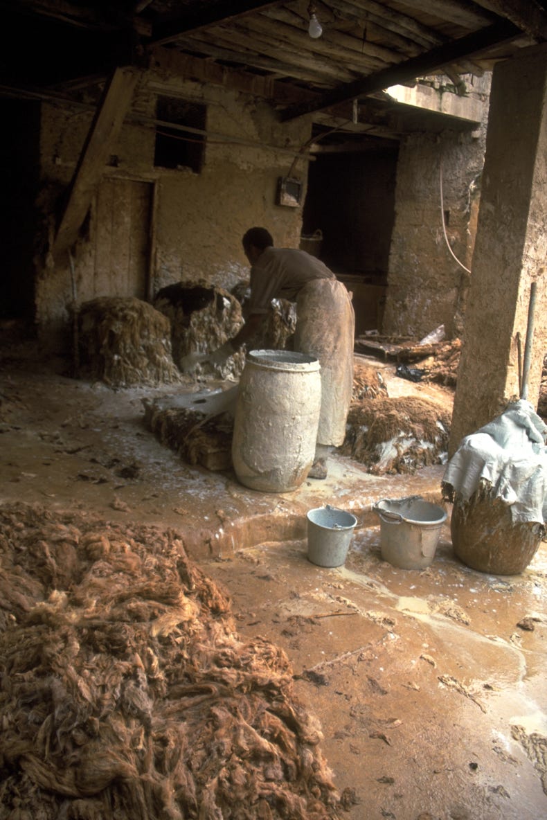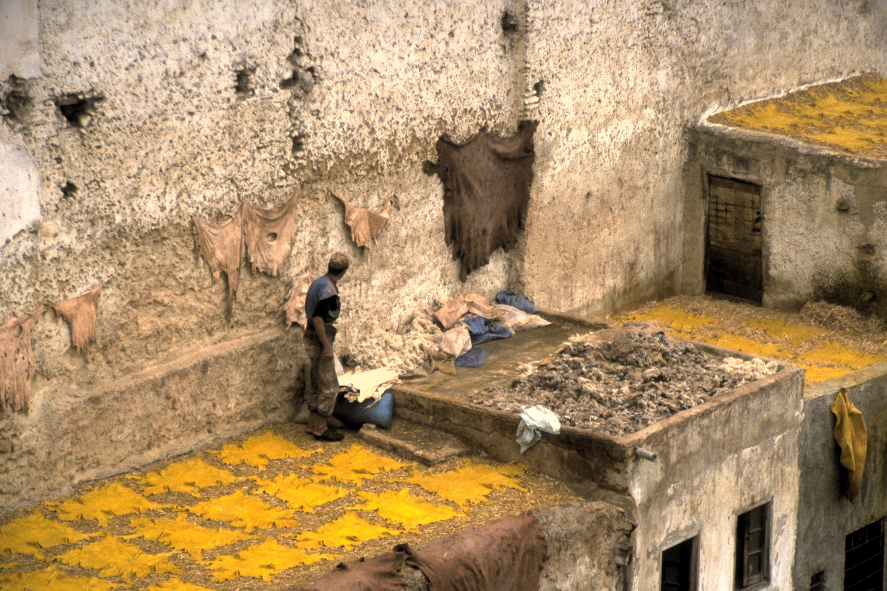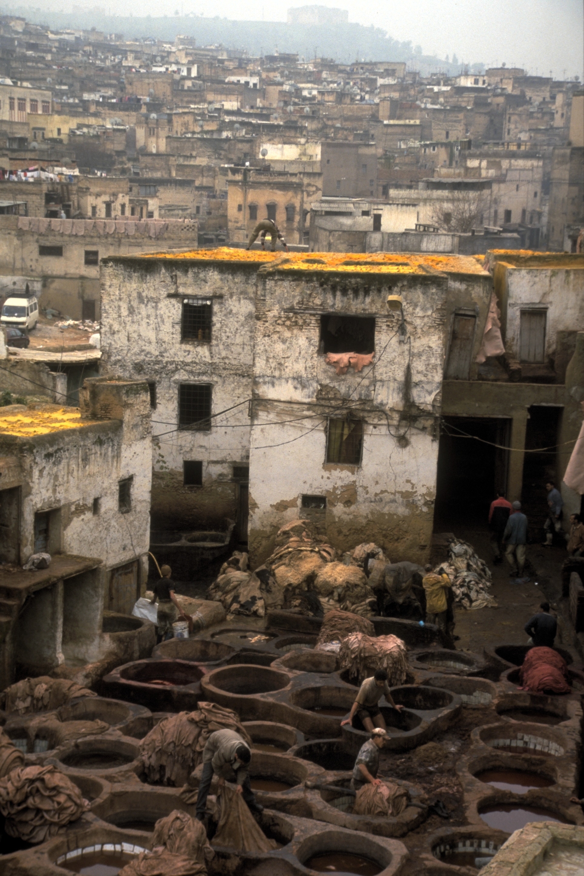 Fez is a fascinating and exhilarating mix of sights, colours, sounds and smells, but it was a bit overwhelming at times for Di, who wasn’t feeling to well (she blamed the egg she ate at breakfast). I think she enjoyed the town, but she did not want to stay too long, especially after we visited an open courtyard area near one of the major gateways into the town where there was a strong smell of urine (for a fairly obvious reason given the use of that land!). A highlight of walking around Fez was a visit to the tanneries, where leather is cured and dyed in large open vats filled with ammonia (actually, goats’ urine) and coloured dyes. The tanneries of Fez are one of the amazing sights of the world, but the price of seeing them is enduring the salesmanship of the leather merchants who own the viewing platforms. It was worth it, though – Di bought two very good leather handbags.