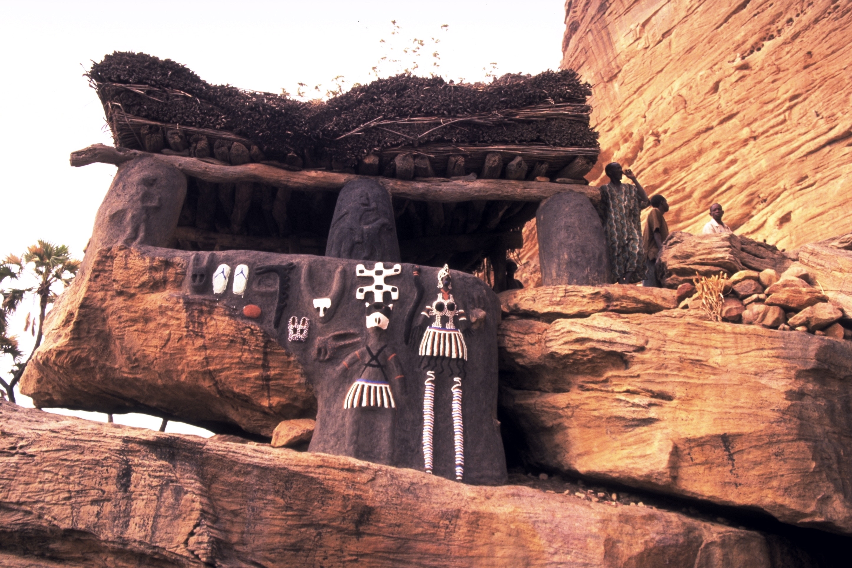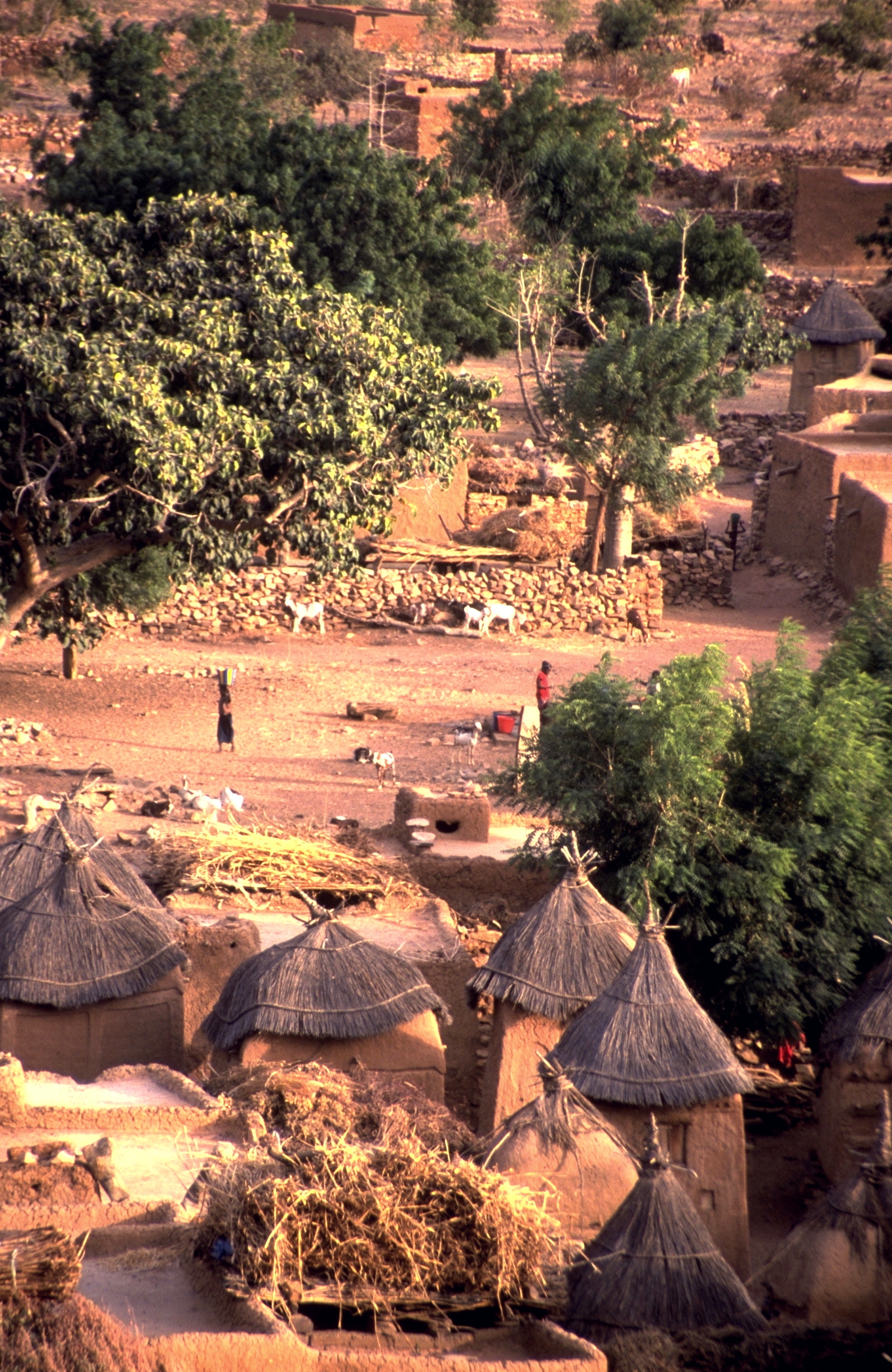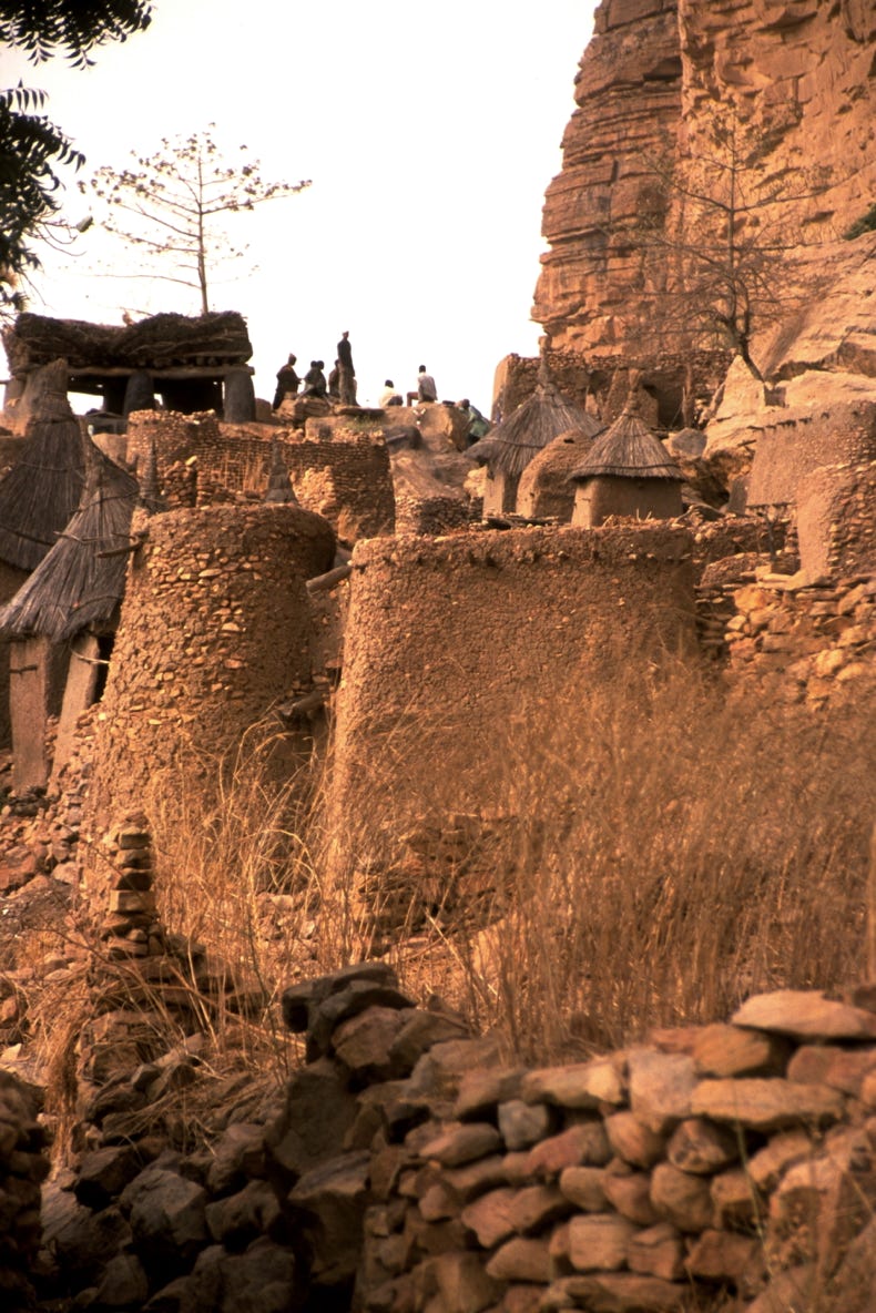 Not a great introduction to Dogon Country, we then proceeded right to the edge of the escarpment and descended down to the more typical villages. Our main visit was to a village called Ireli, which was fascinating. From a distance, the village is almost invisible because the houses look like the scree that has fallen down from the escarpment above. But upon closer examination, the form of a village emerges from among the rubble – a dense network of mud brick houses interspersed with small storage buildings called gran stores (which actually store all of a person’s valuables), topped with distinctive conical straw roofs if owned by a male.