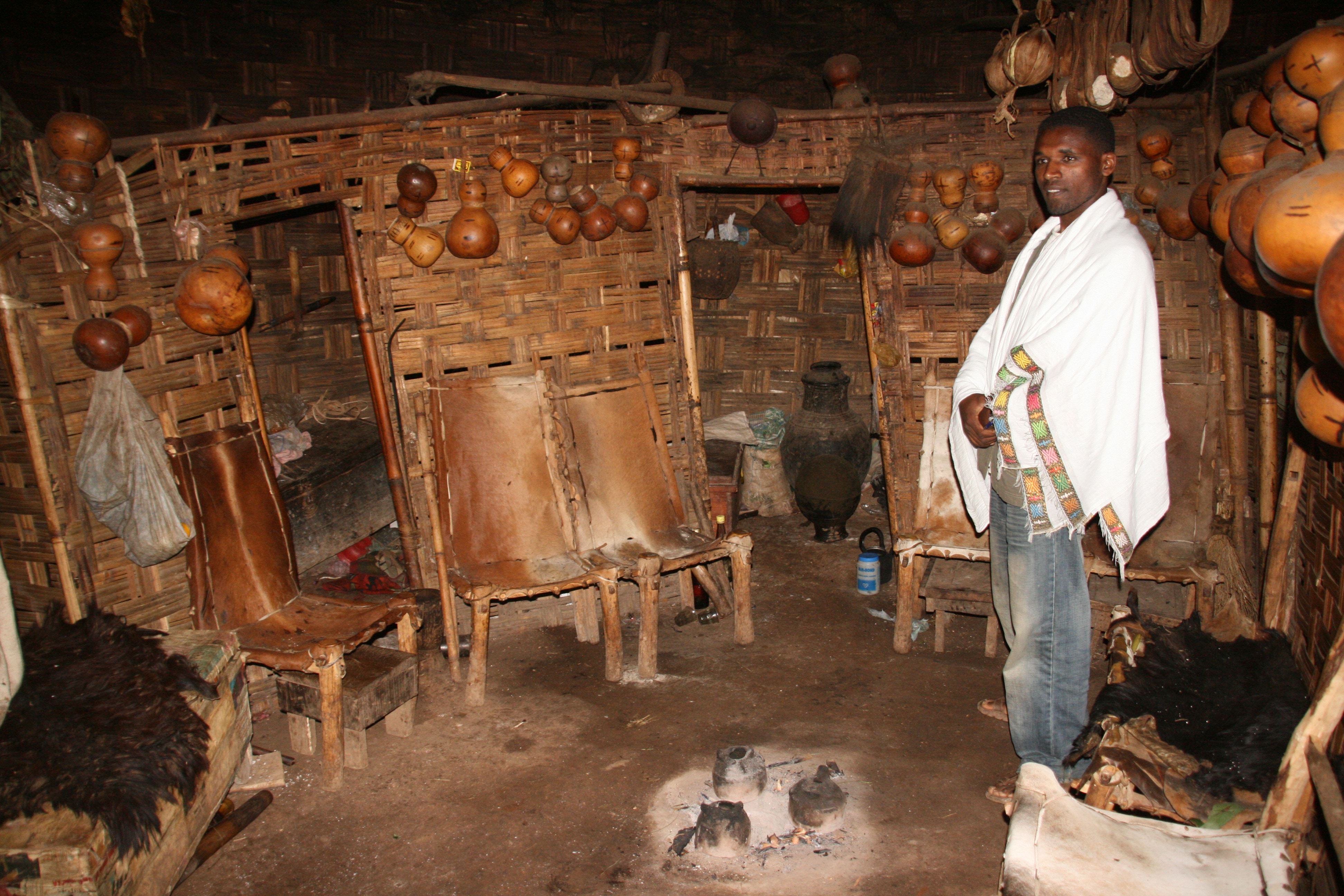 In the main section of the village, a woman was shredding the leaves of mock banana trees. The fibre is buried for three to four months, during which time it ferments. After that time, the resulting paste can be cut and pressed between banana leaves into a dough to make a type of flat bread called ‘enset’, which is prepared by cooking for about 5 minutes. Andy and I were invited to try some of the hot bread, which we did, finding it very tasty indeed - though it was perhaps more to our liking without the hot chilli paste that the local people spread on it.