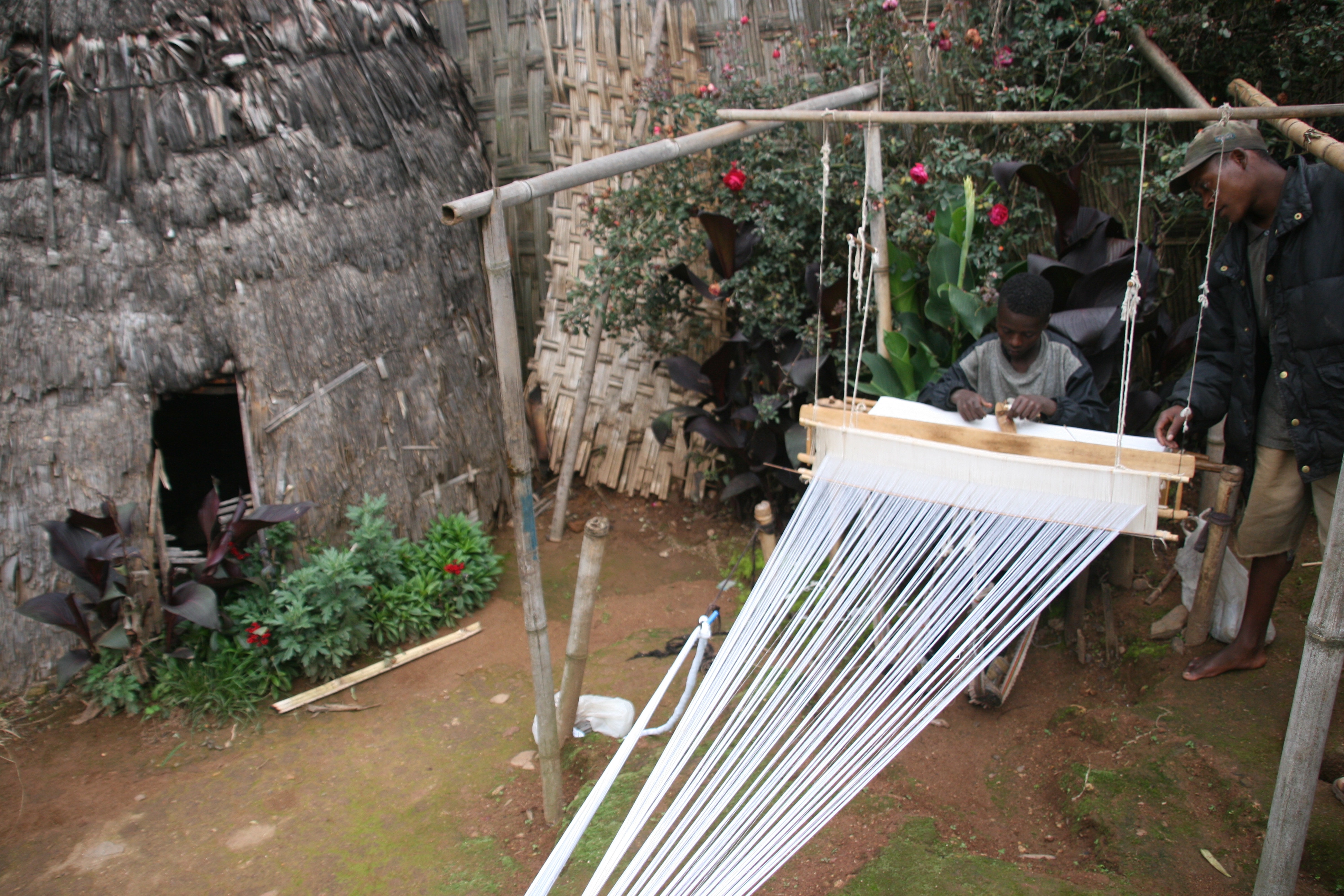 The community building has space for animals on one side, sleeping areas for people on the other, while in the middle there is a place for people to gather around a fire which, like the grass huts of the Dani in Irian Jaya, collects the smoke inside the hut for warmth as there is no chimney; the smoke slowly oozes upwards and outwards through the thatched roof. To the left of the community house was the honeymoon house, where newly married couples spend the first three months of their marriage. To the right of the community house was another small hut, outside which men and boys weave cloth that may only be worn by the men.