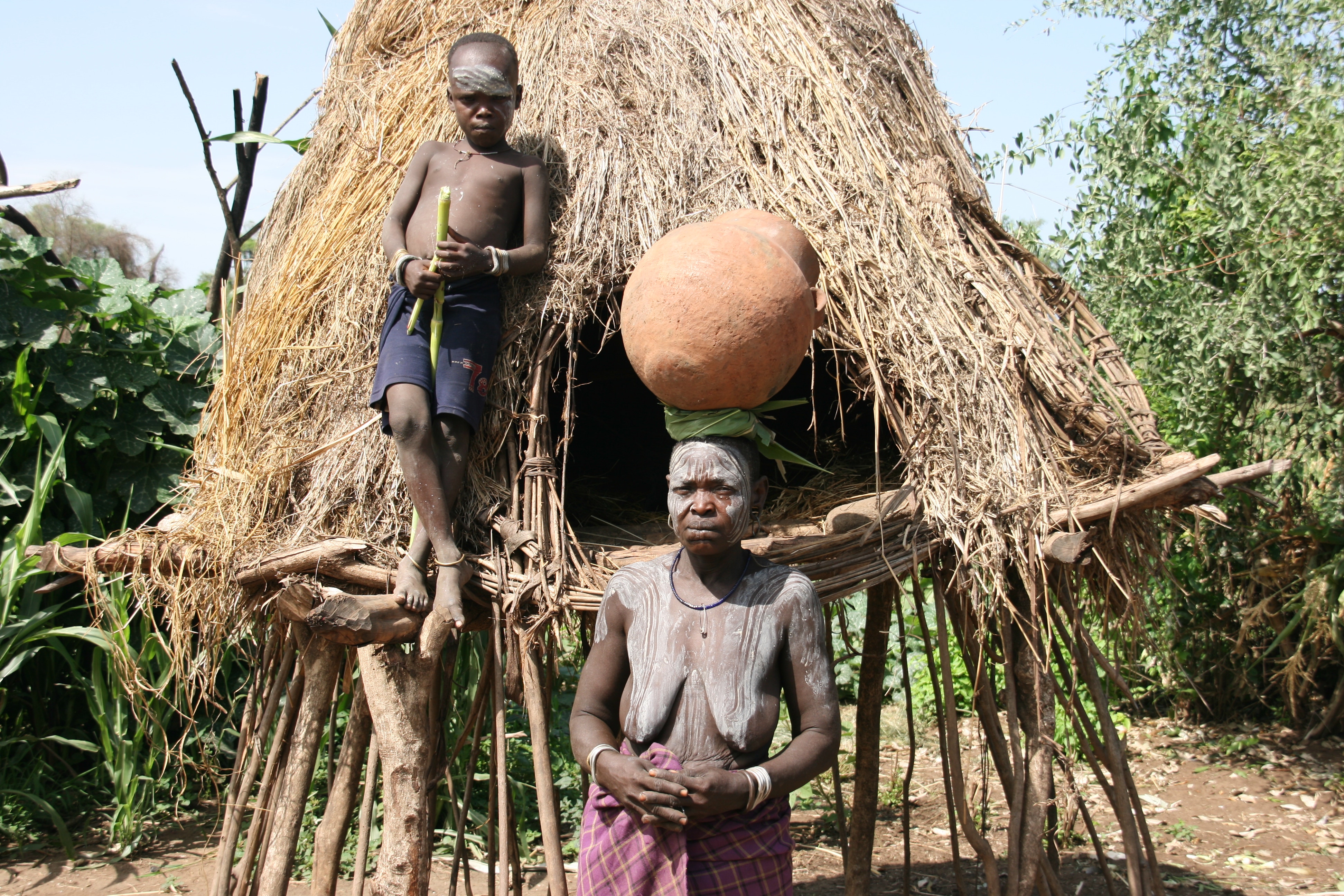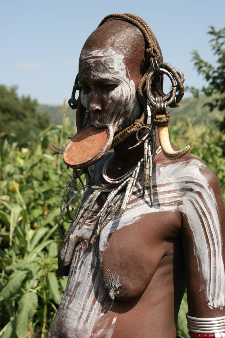 One of the unique features of the Mursi people is that women wear lip plates. These are made of clay and may be up to 15 cm in diameter. At about the age of 12, a slit is made between the lower lip and the jaw, and plates of increasing size are inserted as the lip stretches. The lip plates are not worn all the time, and many of the women we saw this morning were walking around with their lower lips swaying around below their jaws.
