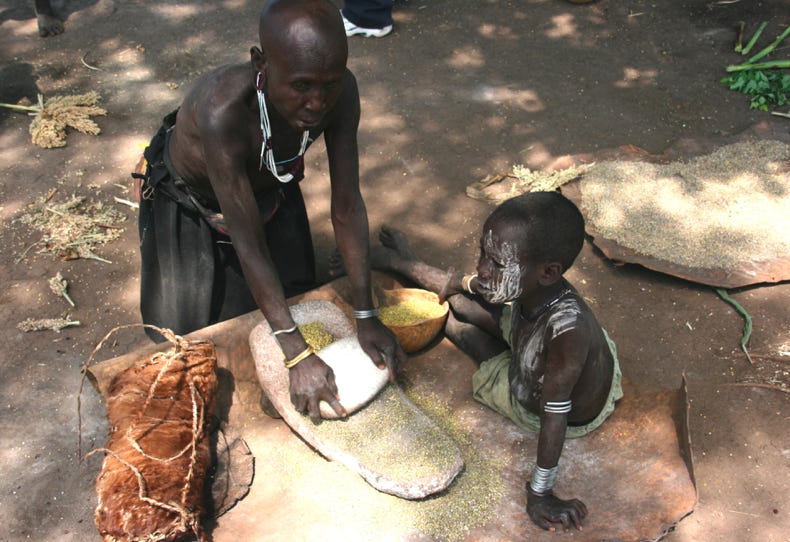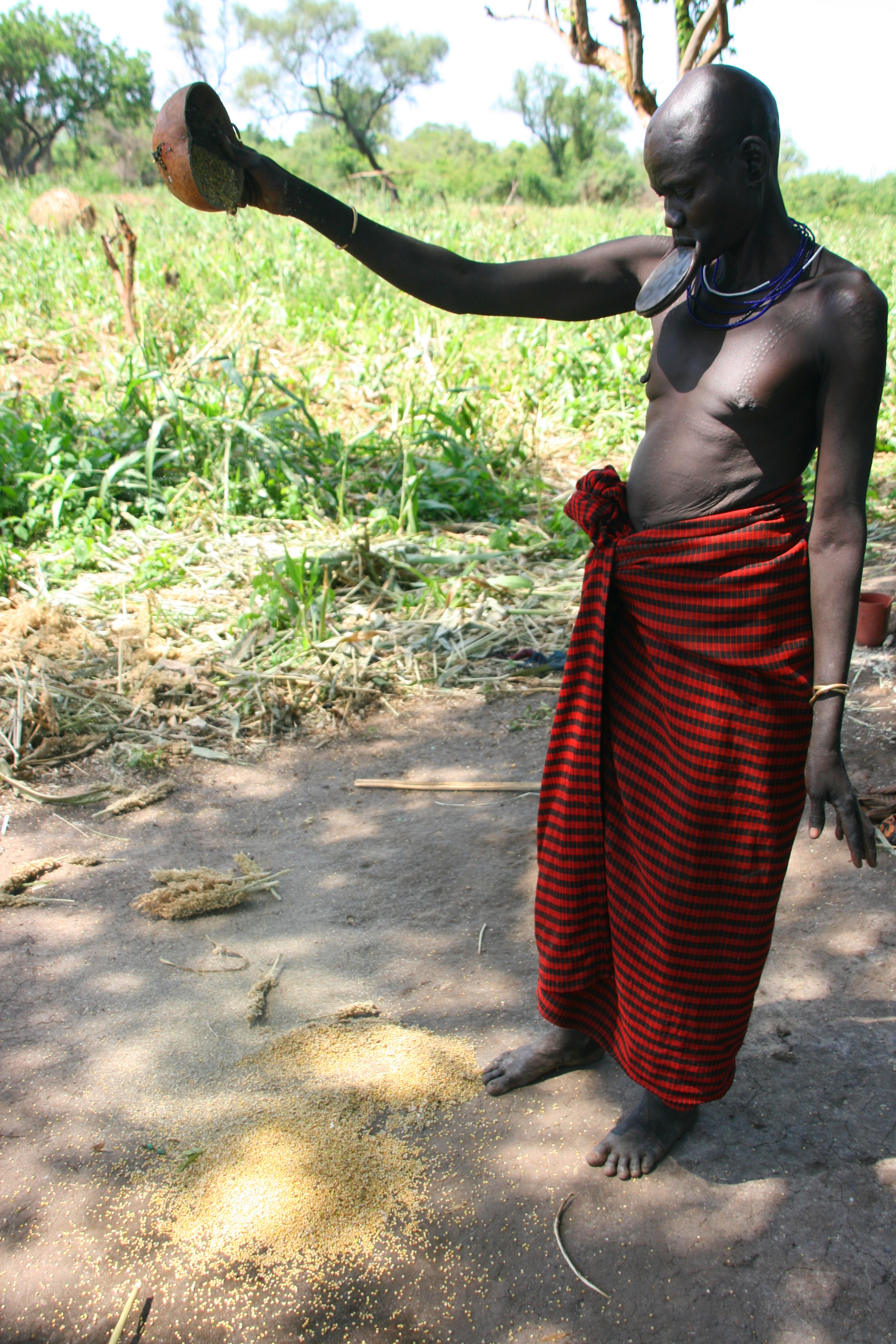 The main activity of the Mursi people is raising cattle, which is why they are nomadic; they move according to the seasons. When they settle in one place for a while, they cultivate some sorghum, and we saw evidence of that this morning with cultivated fields beside the village compound, and some women were milling sorghum by hand while others were winnowing the seeds. Most of the people in the village when we visited were women and girls because the majority of the men and boys were away tending the cattle.