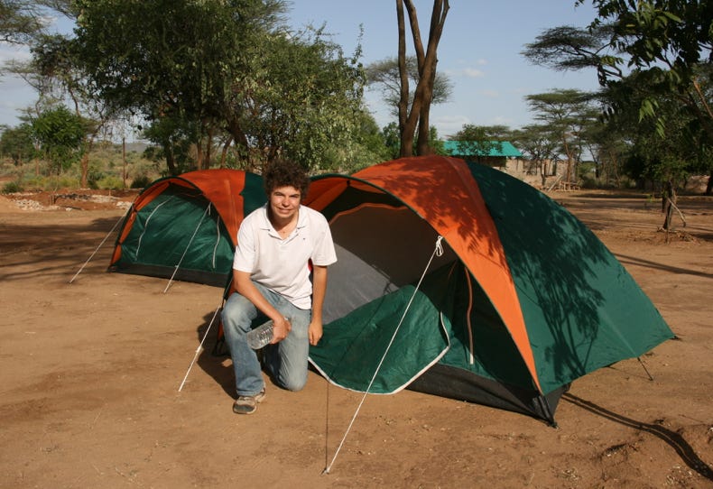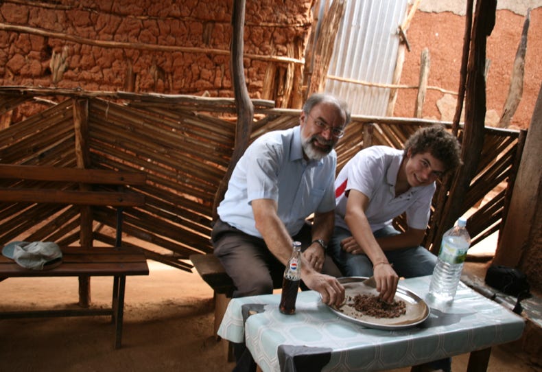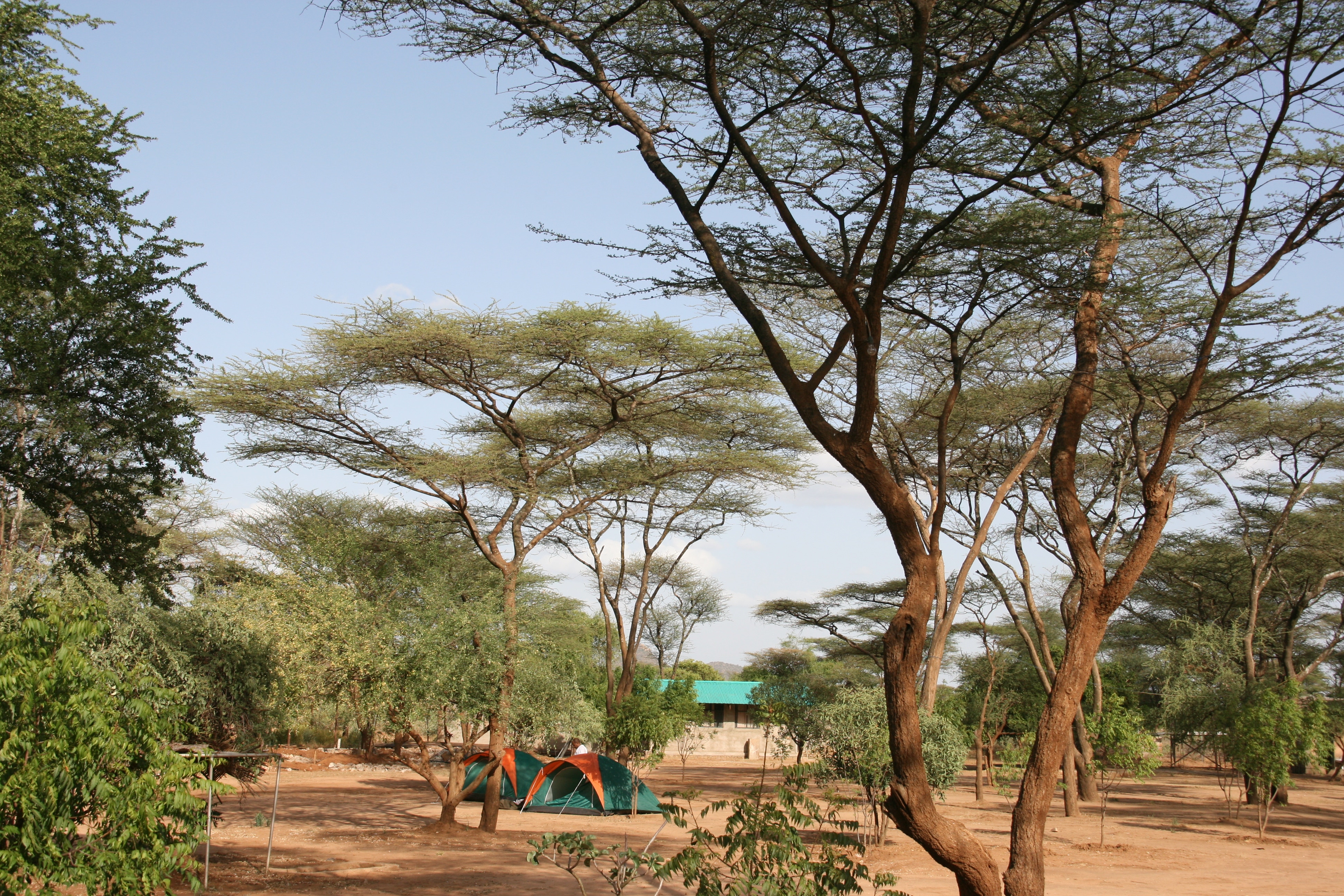 The campsite did not serve any food, so at about 7:00 pm we took a short walk into town to have dinner at an eating house. To the accompaniment of 100 decibel music being played through miniature speakers, we had vegetable soup (the only kind on the menu - or it would have been if they actually had a menu) followed by goat meat on injera for Andrew and spaghetti for me. We ate outdoors in the shade of an acacia tree in the post-sunset dusk, with a refreshing breeze blowing a never-ending supply of flying ants into our faces. It was great!