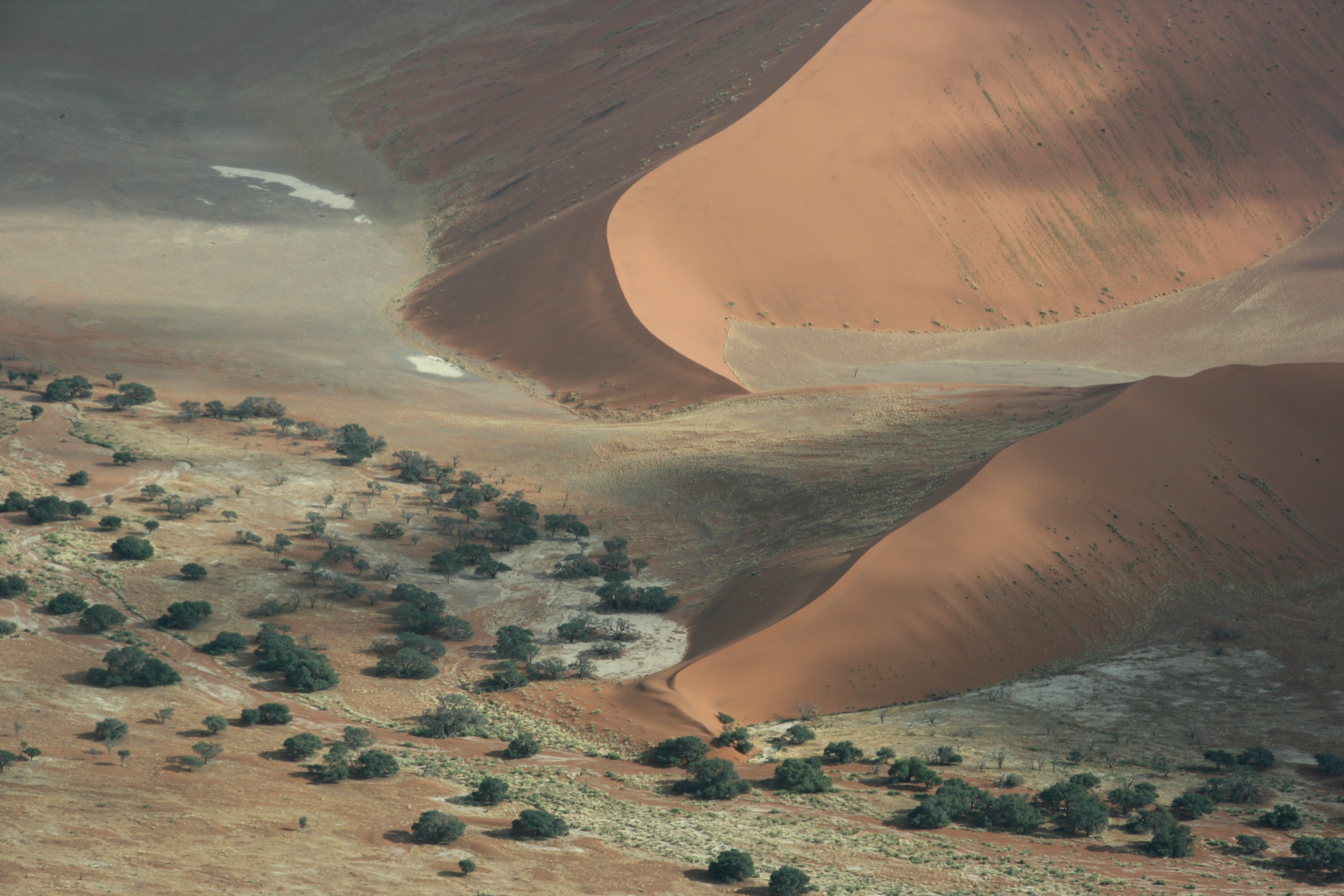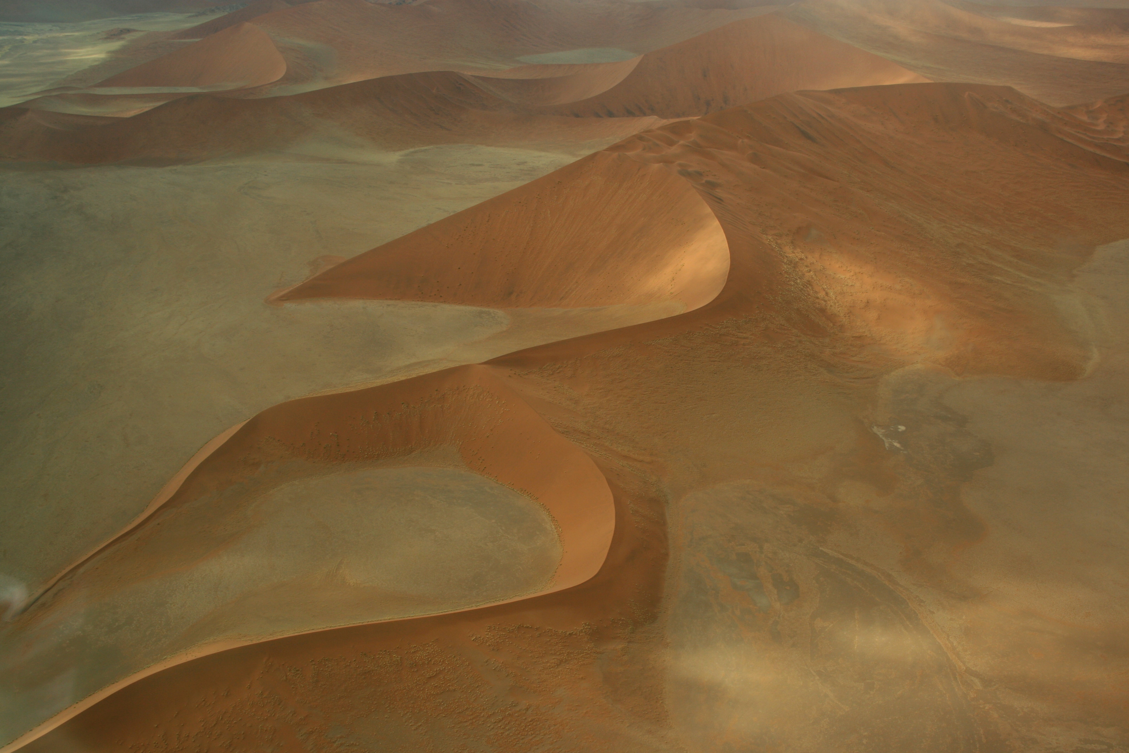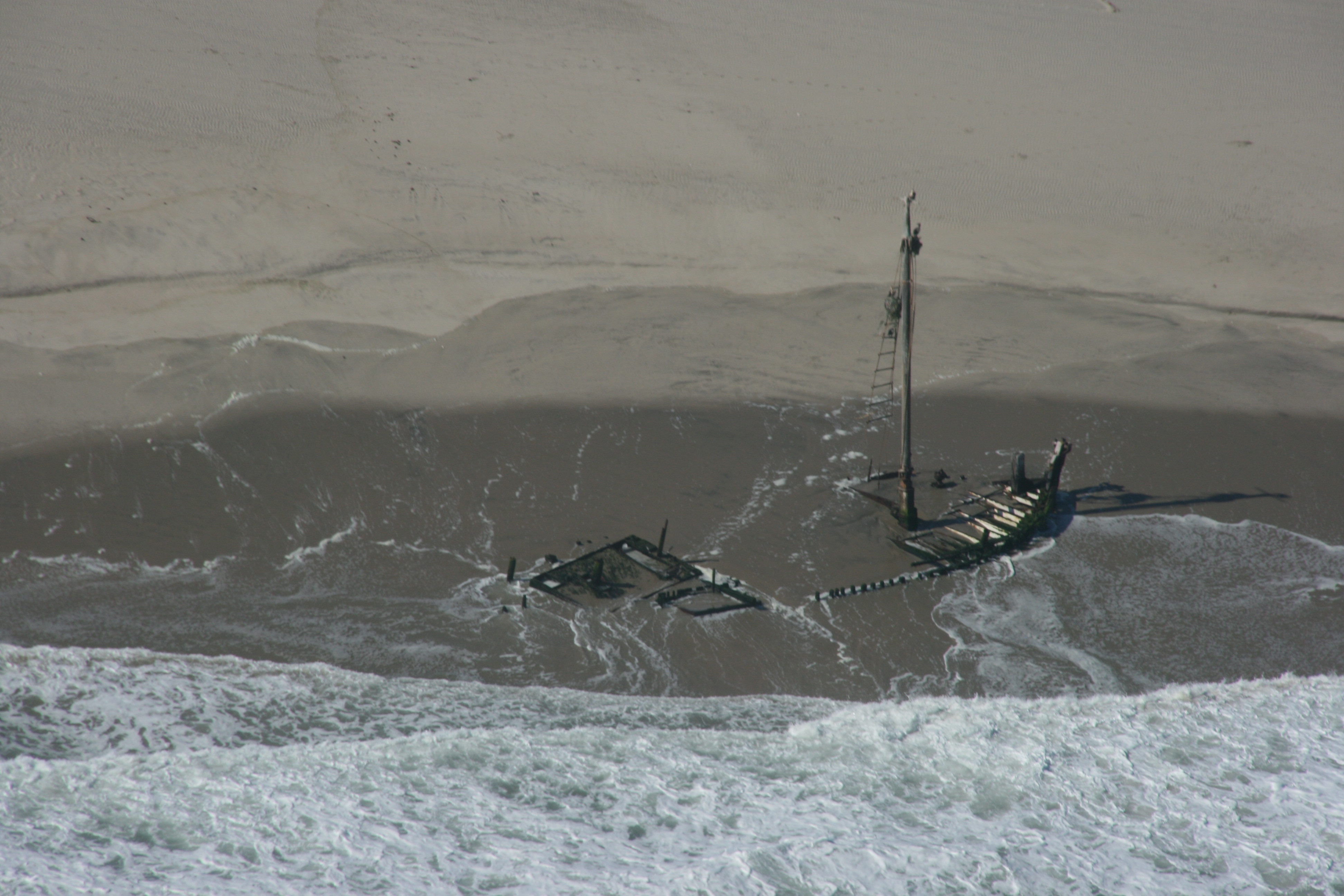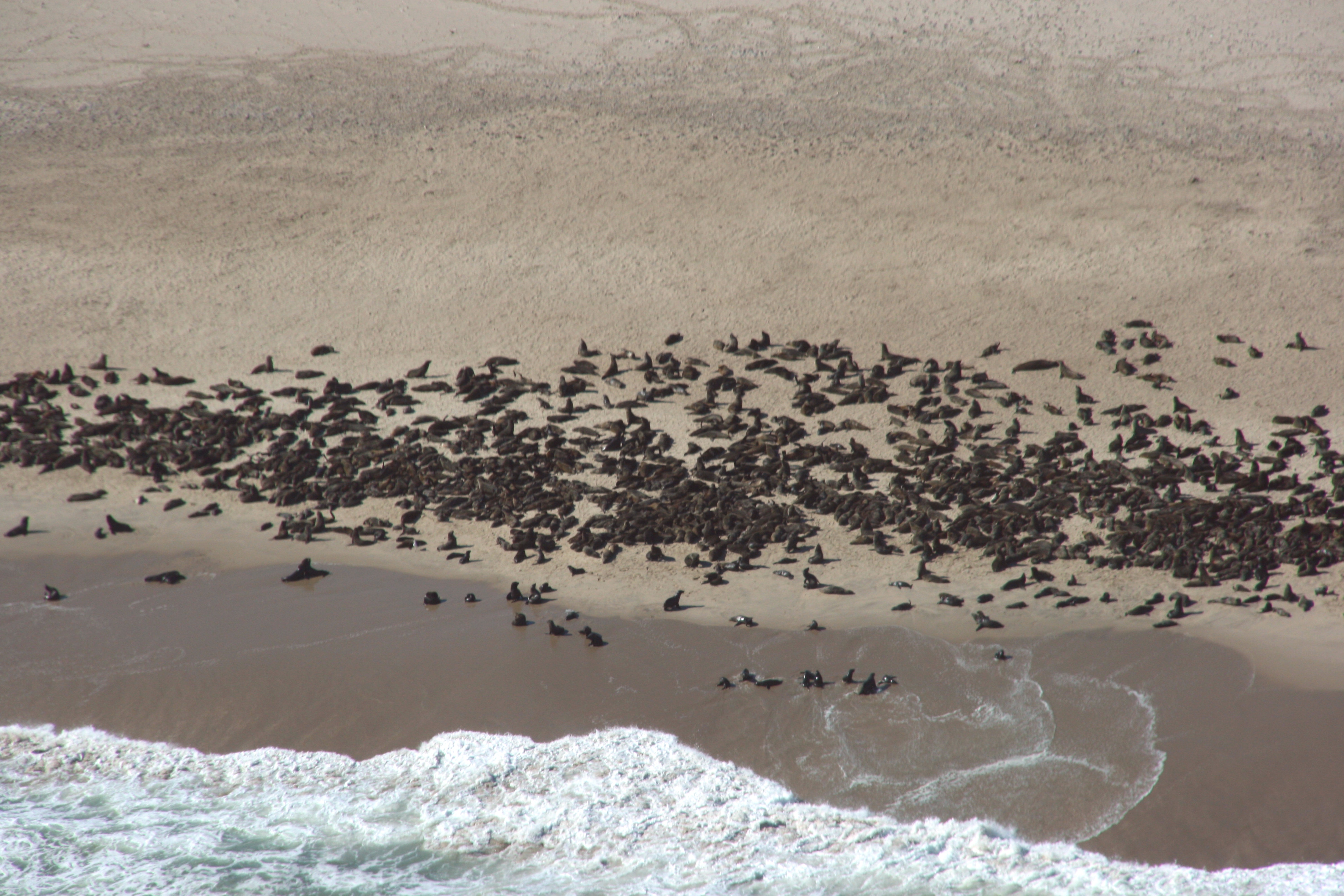 After the plane had refuelled at Swakopmund, we continued north, flying along the Skeleton Coast. This stretch of coastline derives its name from the many rusting shipwrecks found along the shoreline. Although the sands of the Namib Desert stretch right to the western shoreline, the coast is often shrouded in fog (as a result of the cold ocean current that flows along the coast), and it is thus notorious for its danger to shipping. We saw at least 8 shipwrecks as we flew along the coast, and no doubt many more lie buried beneath the shifting sands. Even more surprising was seeing several seal colonies, each containing several hundred (and perhaps a thousand or more) seals. Other points of interest were several old diamond mines, a number of large dry river beds, and some huge dune fields.