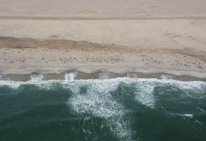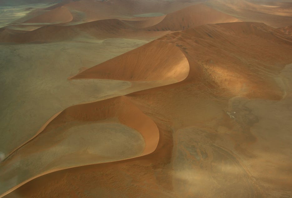 The flight was fabulous – an intense geographical, observational experience. We took off in perfectly clear weather and initially headed south-west towards an area of towering red sand dunes of the Namib Desert. This was perhaps the one disappointing feature of the day; there was a thick fog over the dunes. The pilot claimed that he had never seen a fog in that area before, and started taking photos with his digital camera. I have to say that he was much more excited about the fog than I was! However, knowing that we wanted to see the dunes, he circled downwards in an effort to get under the fog (without hitting the ground), and for the most part he succeeded. Although there were sections of the dunes that were hidden from us, we did get a reasonable if patchy view. We continued heading west towards the cost, flying over Walvis Bay (Namibia’s main port city) before touching down at Swakopmund.