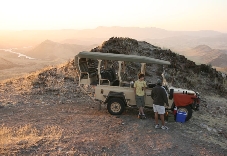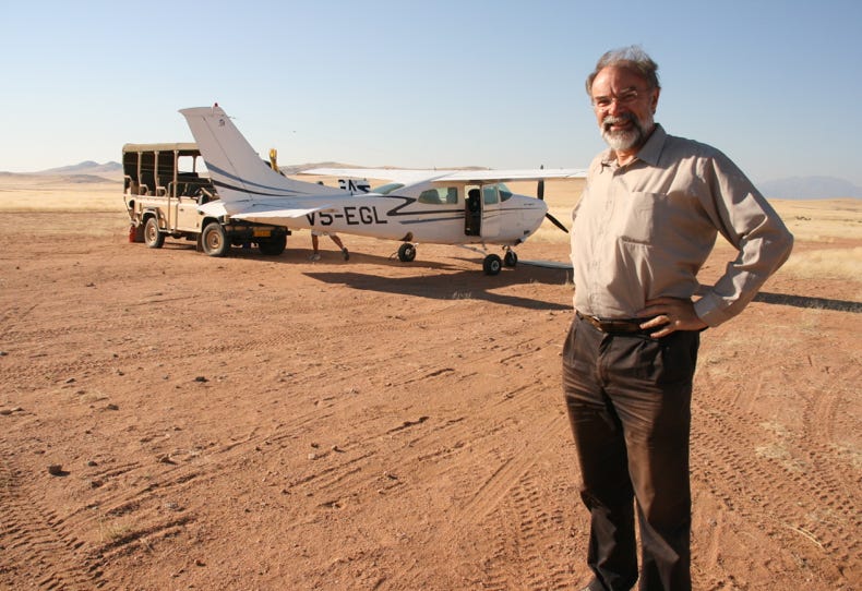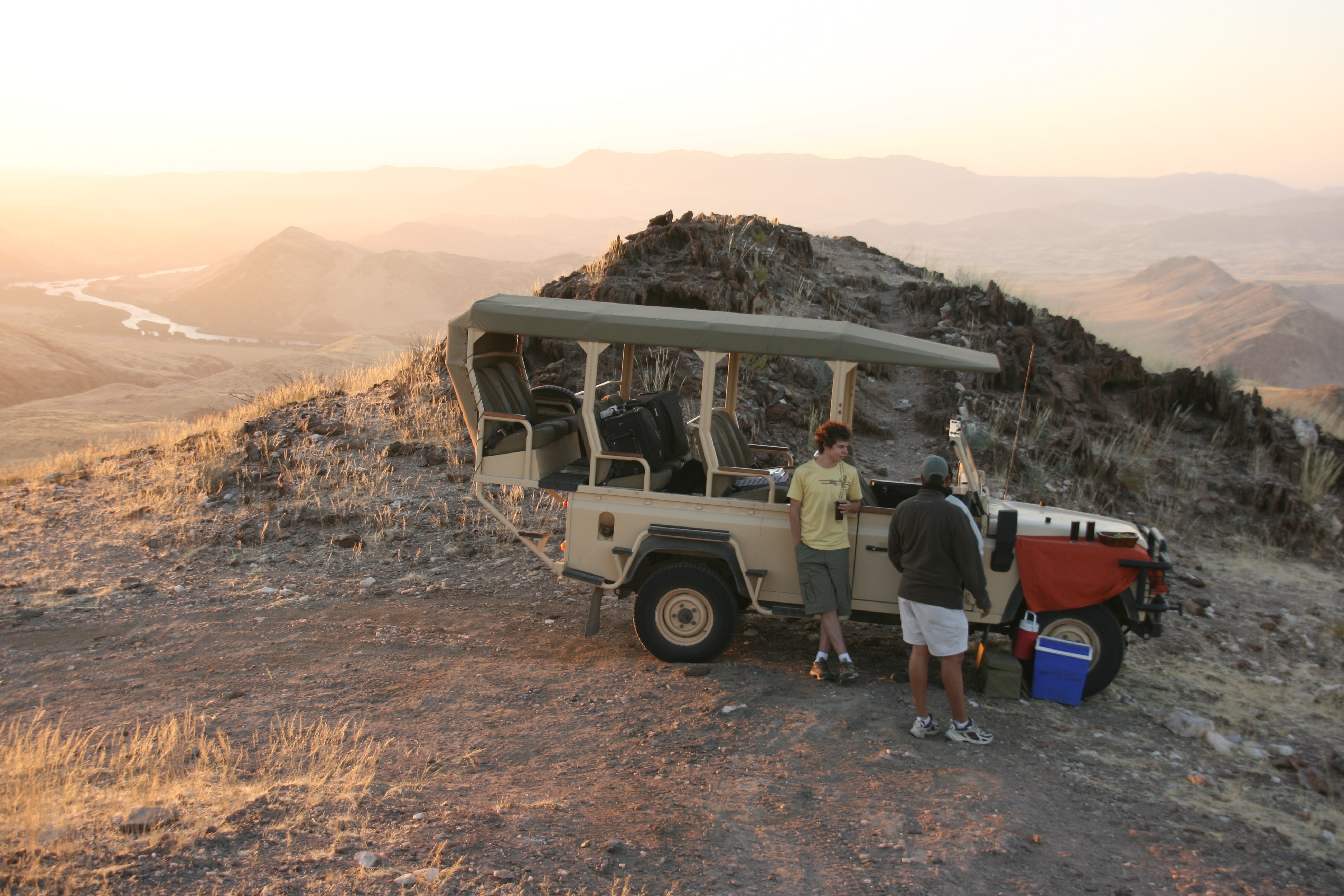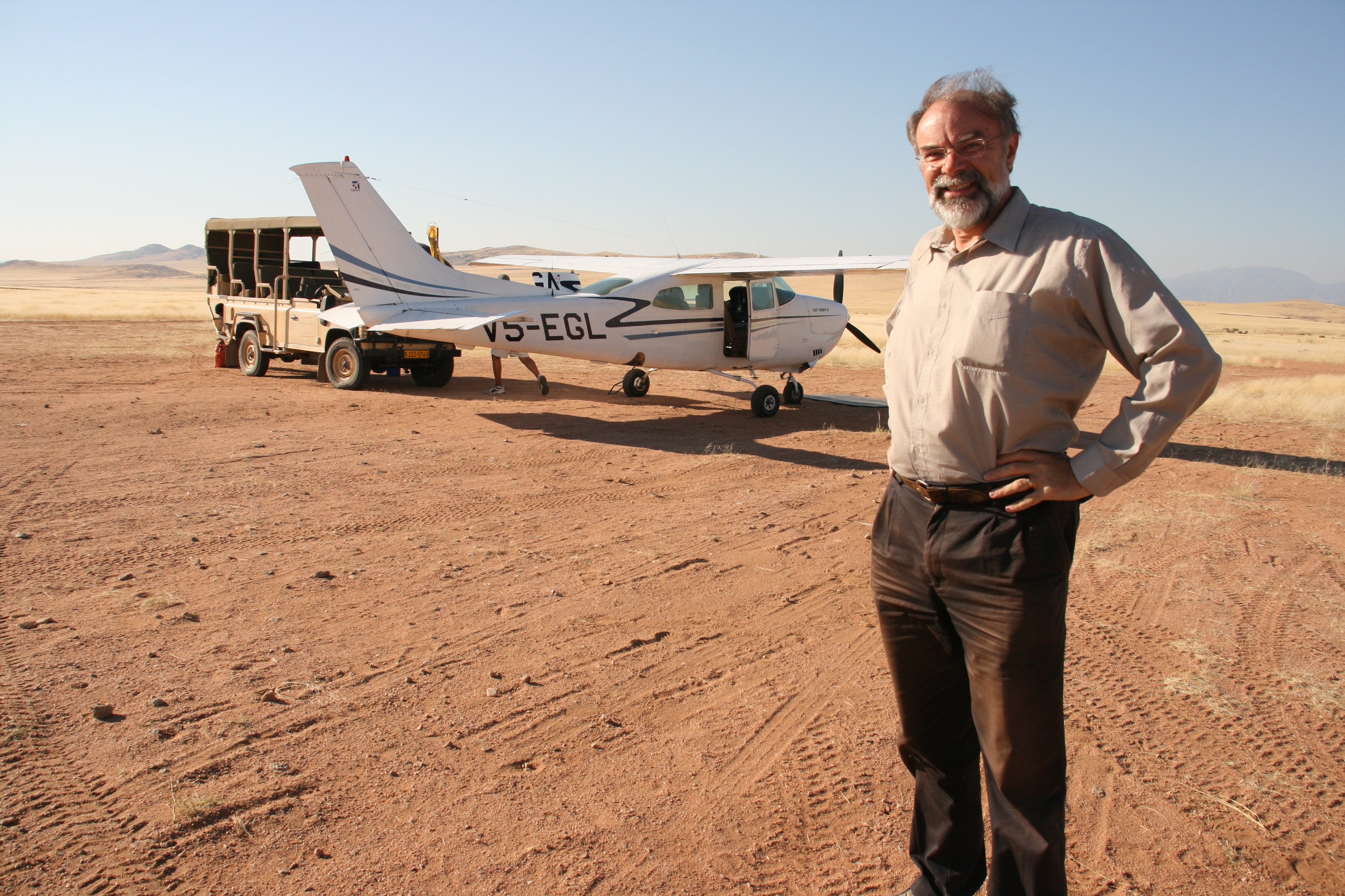 The only way to reach the north-west corner of Namibia, known as the Kaokeveld, within our time limit is to fly. We took a small Cessna 210 operated by Sefofane Air which flew two legs. The first leg was a two and a half flight west to Swakopumund, where the plane had to refuel. The second leg was a three hour flight north to Hartmann Valley airstrip, from which we needed a one hour drive in a 4WD to reach our campsite. The photo to the right shows our plane after arrival at Hartmann Valley airstrip, together with the 4WD that came to meet us and transfer us to our accommodation.
